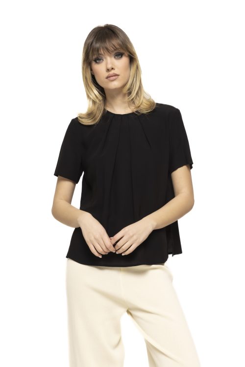 Bluza cu pliuri Clara impresionează prin simplitate și atenția la detalii. Croiala lejeră avantajează diferite tipuri de siluetă, oferind libertate de mișcare și o linie elegantă. Mâneca scurtă și decolteul rotund completează designul clasic, făcând această bluză potrivită atât pentru ținute office, cât și pentru apariții casual-elegante.