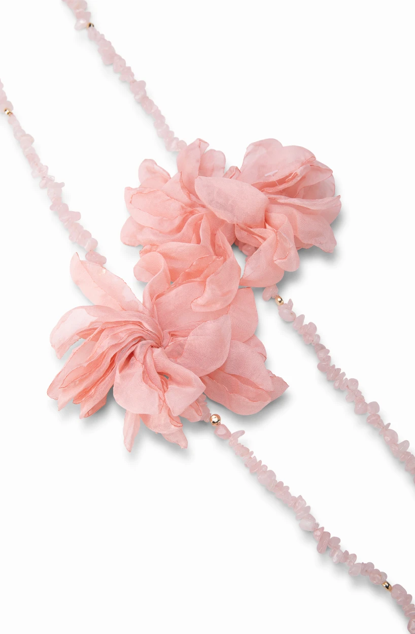 Colierul Roxana se remarcă și prin structura sa elegantă, compusă din mărgele decorative dispuse de-a lungul lanțului. Aceste elemente completează perfect designul floral și oferă colierului un aspect modern și stilat. Combinația dintre mărgele și florile textile creează un accesoriu original, care atrage subtil atenția și evidențiază stilul personal al purtătoarei.