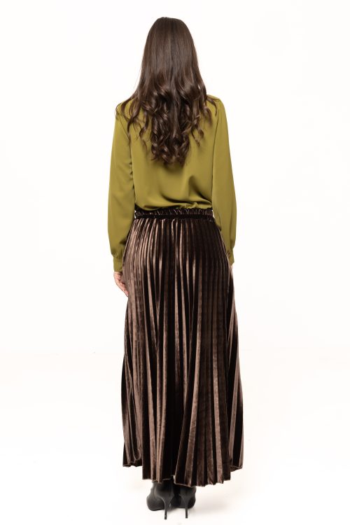 Fusta plisată din catifea Criss este extrem de versatilă și poate fi purtată în multiple combinații vestimentare. Pentru un look elegant de seară, fusta poate fi asortată cu o bluză satinatată sau un top fin, completat de pantofi cu toc, botine elegante sau sandale rafinate. Într-o variantă casual-chic, fusta poate fi purtată cu pulovere oversized, bluze tricotate sau tricouri simple, adăugând un contrast interesant între textura luxoasă a catifelei și simplitatea pieselor casual. Această versatilitate face ca fusta Criss să fie un element indispensabil în garderoba oricărei femei moderne.