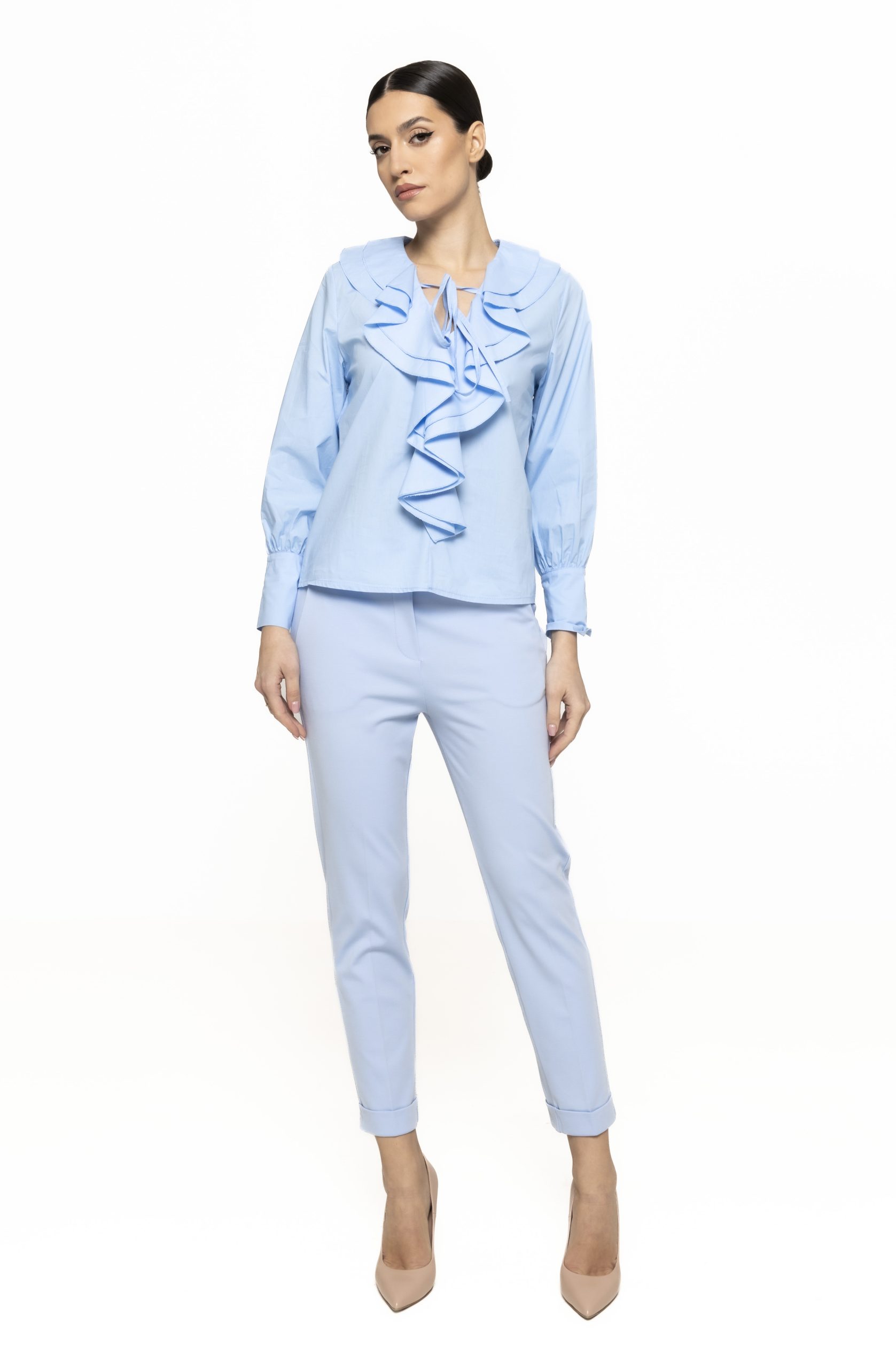 Detaliul tivului întors adaugă un aer contemporan și pune subtil în evidență linia gleznei, oferind un plus de stil. Această lungime este ideală pentru a fi purtată atât cu pantofi cu toc, cât și cu încălțăminte flat, păstrând proporțiile armonioase ale siluetei.