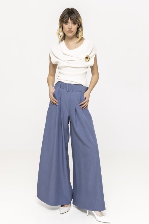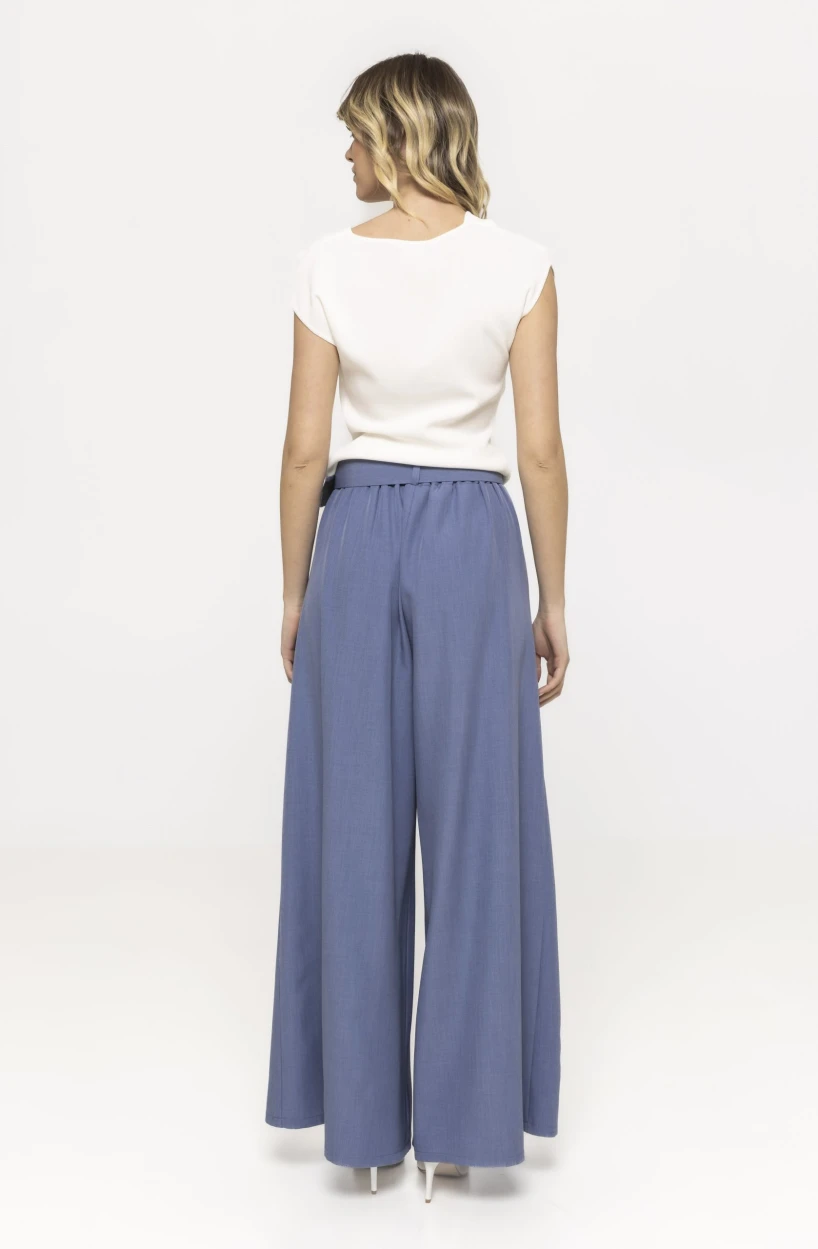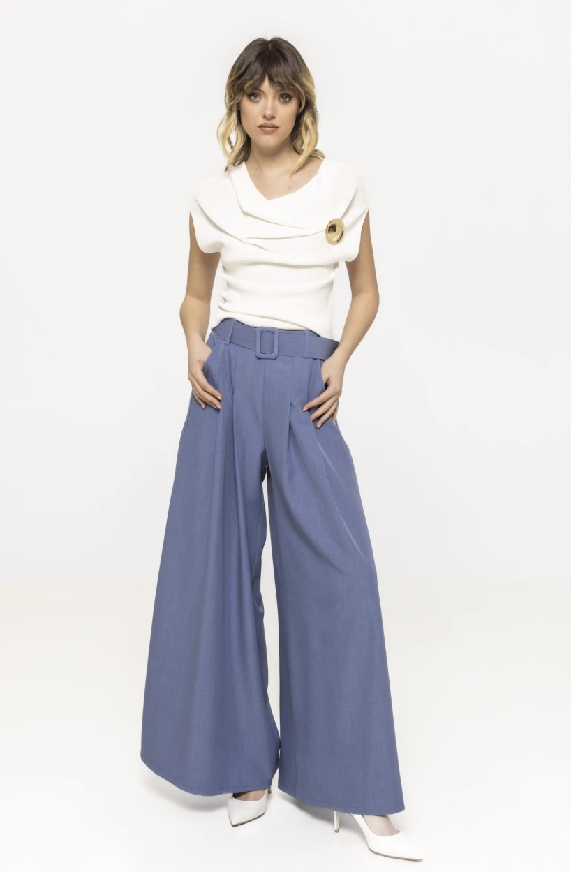 Unul dintre marile avantaje ale modelului Holly este versatilitatea sa. Pantalonul evazat cu curea în talie poate fi integrat în multiple combinații vestimentare: