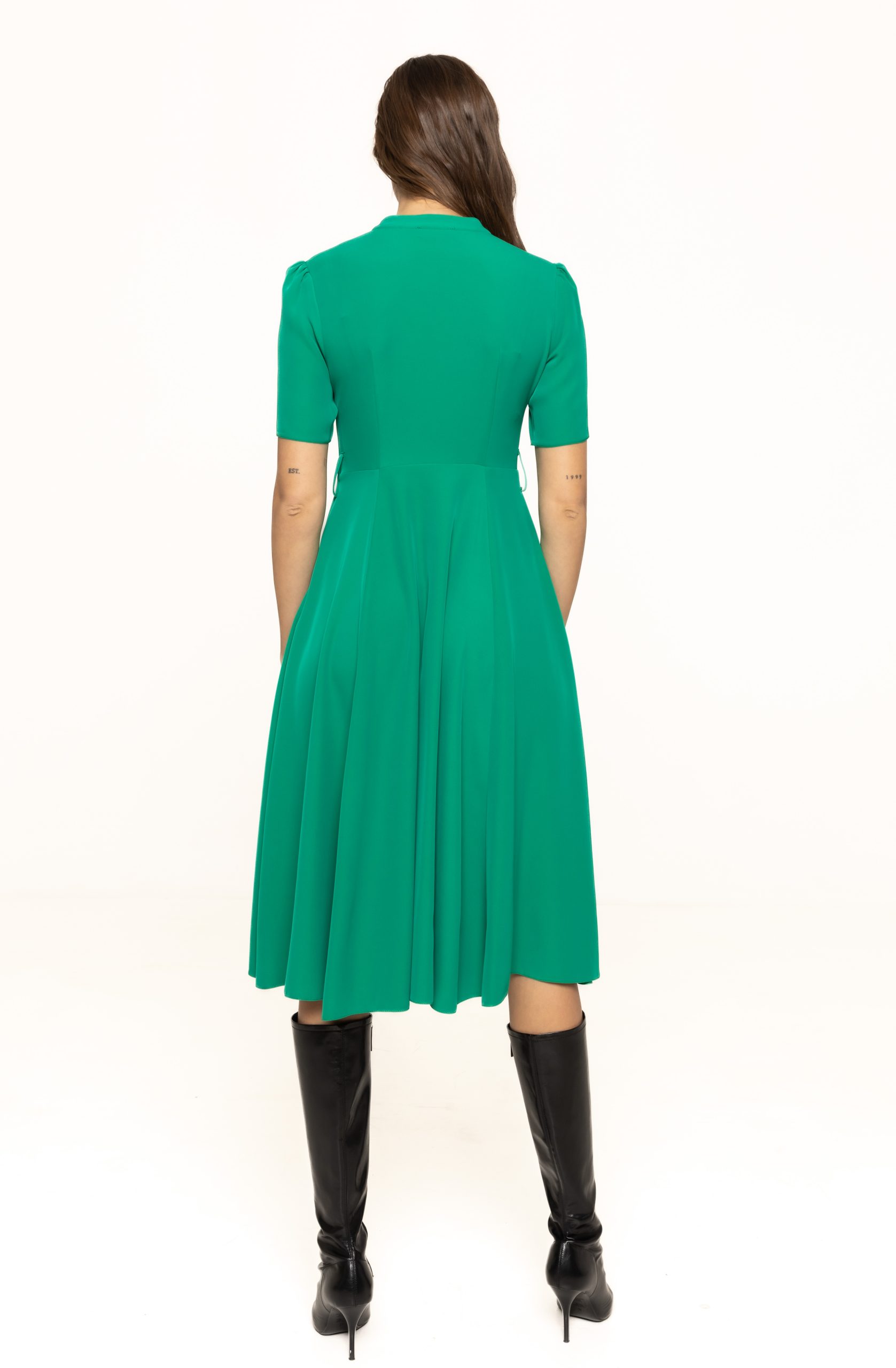Croiala rochiei este una feminină și bine proporționată, potrivindu-se unei game variate de siluete. Linia lejeră, dar totuși elegant conturată, pune în valoare formele naturale ale corpului, oferind un aspect armonios și rafinat. Nasturii aplicați sunt poziționați strategic pentru a alungi vizual silueta și pentru a adăuga o notă de dinamism întregii piese. Datorită acestui detaliu, rochia Paula devine o alegere excelentă pentru femeile care iubesc accesoriile discrete, dar de efect.