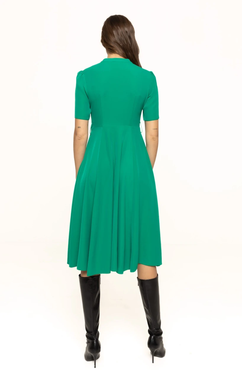 Un alt avantaj important al acestei rochii este versatilitatea ei. Poate fi purtată cu pantofi cu toc pentru o ținută elegantă, perfectă pentru birou, evenimente de zi sau ocazii speciale. De asemenea, poate fi combinată cu sandale sau balerini pentru un look relaxat, ideal pentru plimbări, cumpărături sau întâlniri casual. În sezonul rece, rochia Paula se poate asorta cu o jachetă scurtă, un cardigan sau un palton ușor, transformând-o într-o piesă care poate fi purtată pe tot parcursul anului. Această adaptabilitate o face indispensabilă într-o garderobă modernă și actuală.
