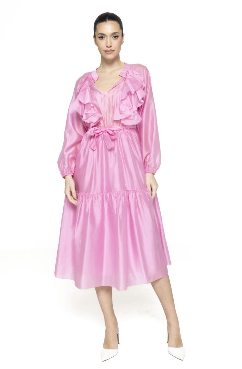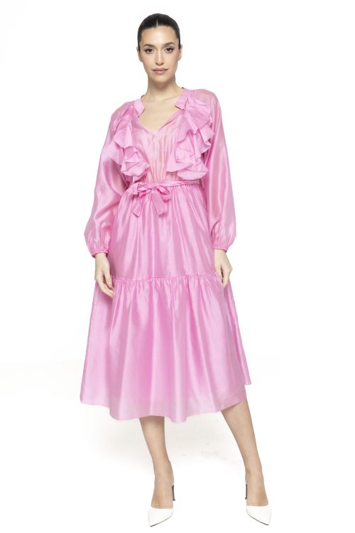 Elementul definitoriu al acestei rochii îl reprezintă volanele, care adaugă un plus de dinamism și feminitate. Acestea sunt dispuse armonios, creând un joc de volume care oferă rochiei un aspect romantic și sofisticat. Volanele pun în evidență mișcarea și conferă un aer lejer și elegant întregii ținute.