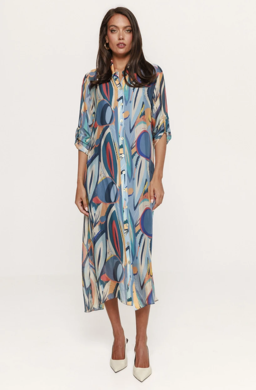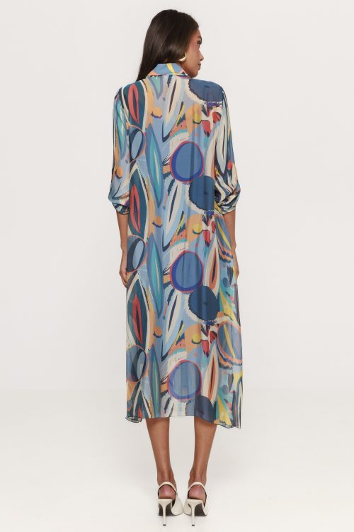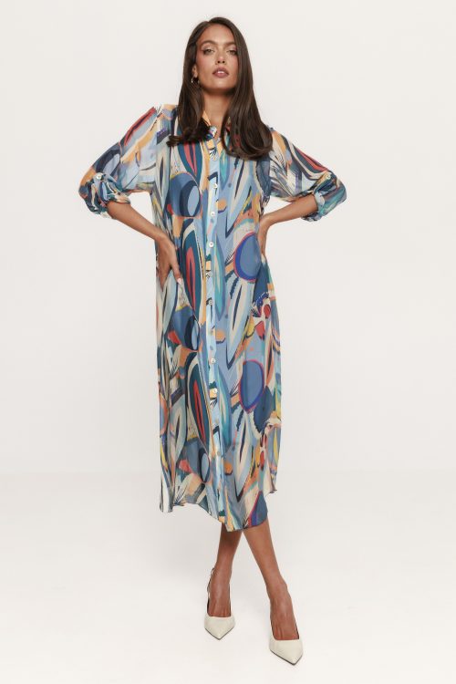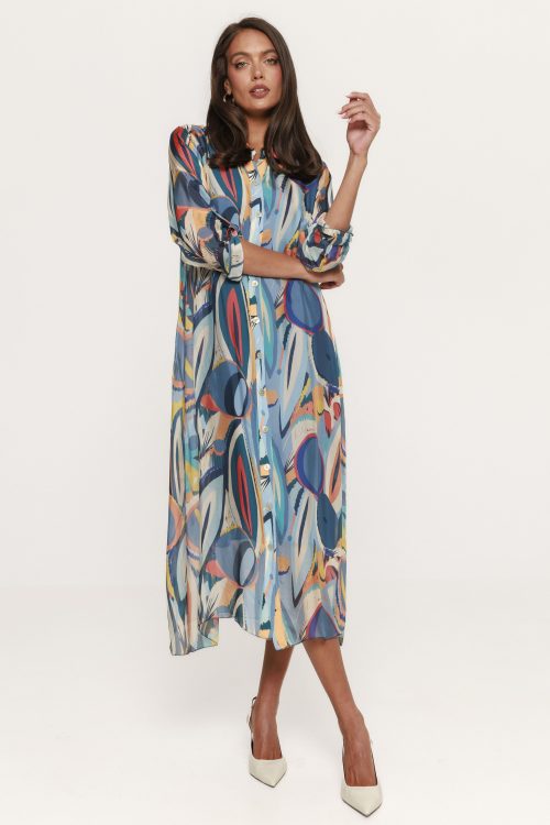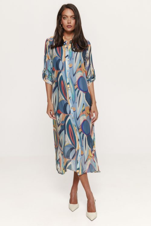 Rochia lungă cu nasturi Odessa este un exemplu perfect de combinație între stilul clasic și modern. Croiala tip cămașă și materialul fin din mătase și vâscoză oferă un look fluid și elegant. Gulerul cu revere scurte adaugă o notă de rafinament, în timp ce mânecile lungi, cu prindere peste cot cu brida și nasture, completează designul într-un mod subtil, dar de impact. Închiderea cu nasturi pe toată lungimea rochiei este un detaliu care adaugă o notă de sofisticare, iar materialul cu imprimeu grafic și floral face ca această rochie să fie perfectă pentru orice sezon.