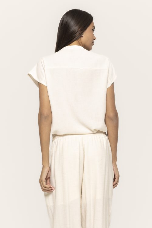 Croiala acestei bluze este gândită pentru a avantaja silueta, oferind un echilibru perfect între lejeritate și structură. Bluza cu mânecă scurtă și nasturi aurii Vica urmărește delicat linia corpului, fără a fi mulată excesiv, ceea ce o face potrivită pentru diverse tipuri de conformație. Această caracteristică contribuie la confortul sporit pe parcursul întregii zile și permite purtarea sa în contexte variate, de la birou până la ieșiri relaxate în oraș.