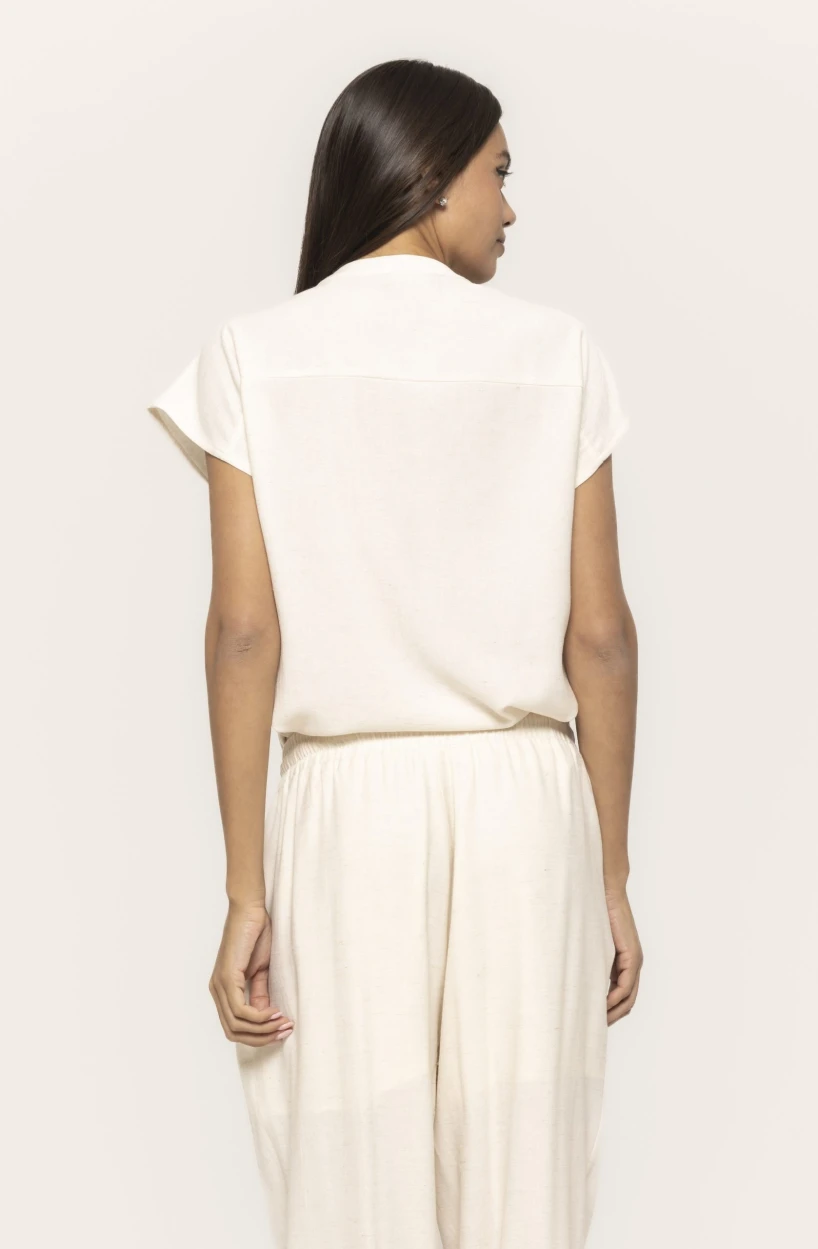 Mânecile scurte adaugă un plus de confort și versatilitate, fiind ideale pentru sezonul cald sau pentru layering în perioadele de tranziție. Bluza cu mânecă scurtă și nasturi aurii Vica este perfectă pentru zilele în care îți dorești o ținută aerisită, dar în același timp elegantă și bine pusă la punct. Designul simplu al mânecilor este completat armonios de restul detaliilor, păstrând un aspect modern și echilibrat.
