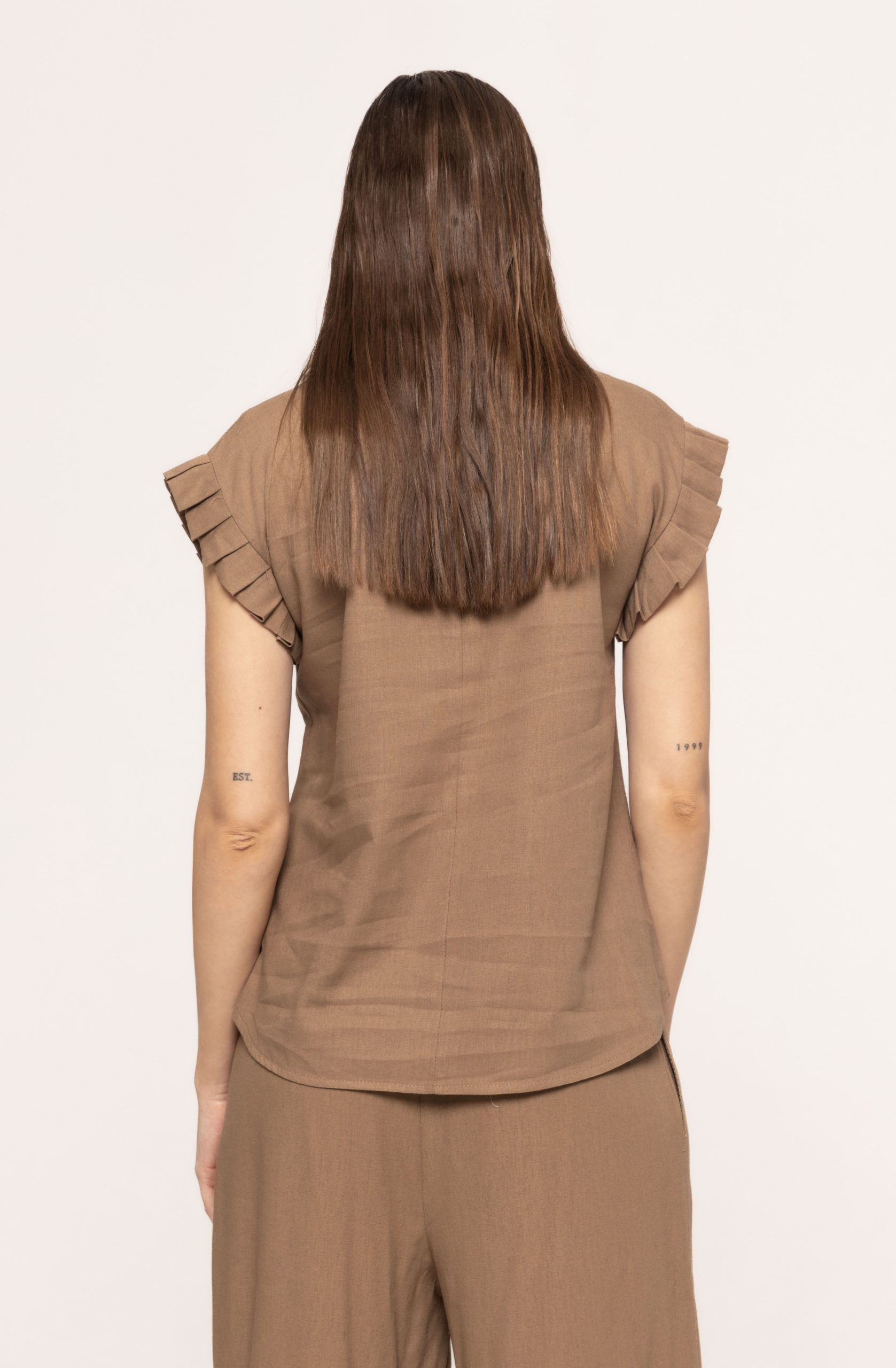 Partea frontală are un aspect curat și elegant, fără închidere, iar linia gâtului este rotunjită și amplasată discret sub baza gâtului. Acest detaliu face bluza ușor de accesorizat – fie cu un colier delicat, fie cu cercei statement.