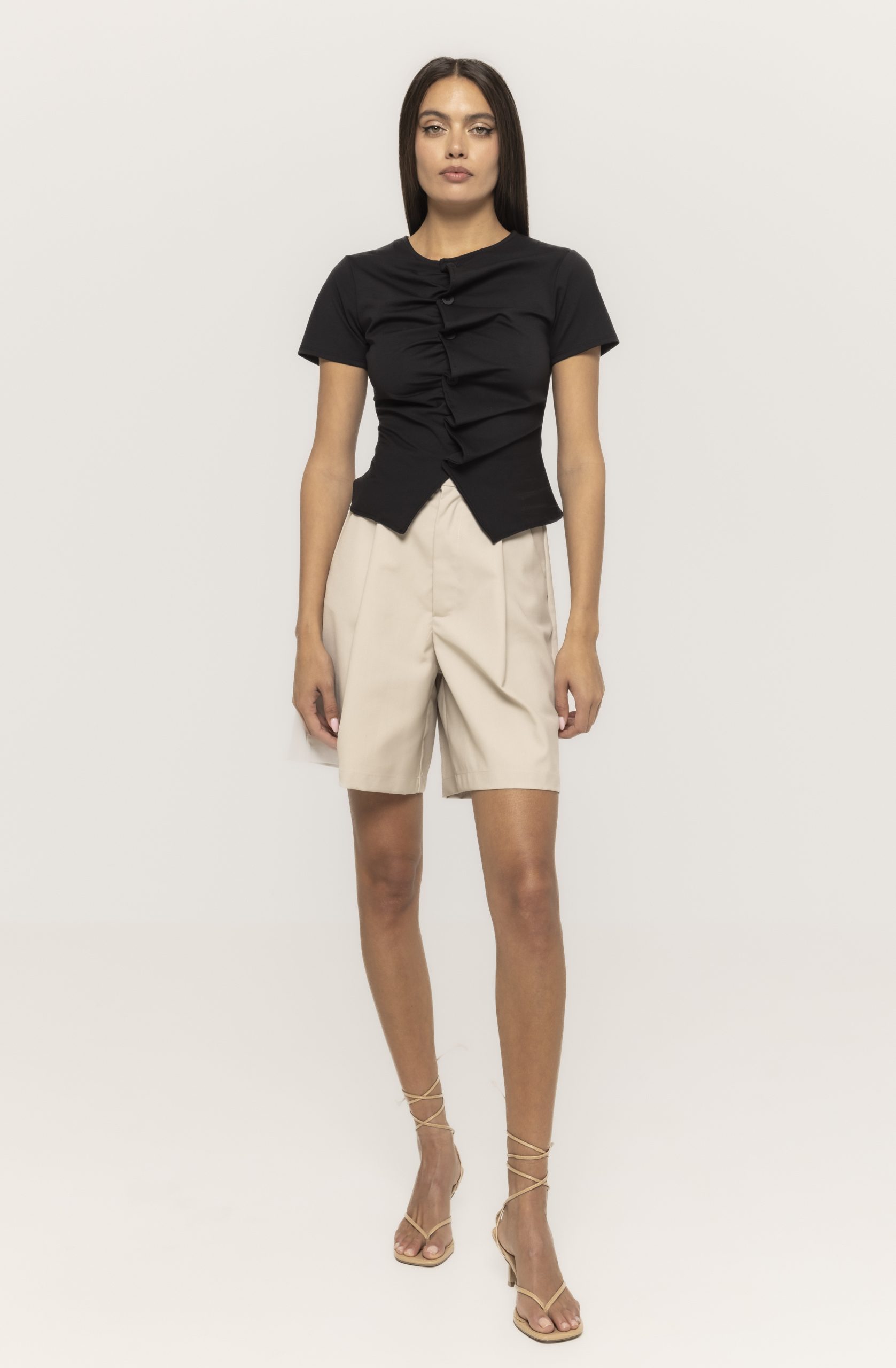 Bluza mulată cu nasturi Holly este perfectă și pentru layering, fiind ușor de purtat sub jachete, cardigane sau paltoane. Datorită croielii sale, nu creează volum suplimentar, ceea ce o face ideală pentru ținutele bine structurate. În același timp, poate fi purtată și ca piesă principală, datorită designului său elegant.