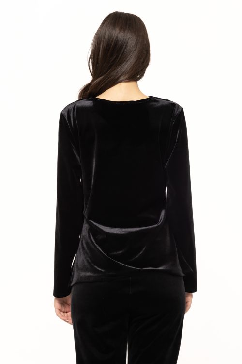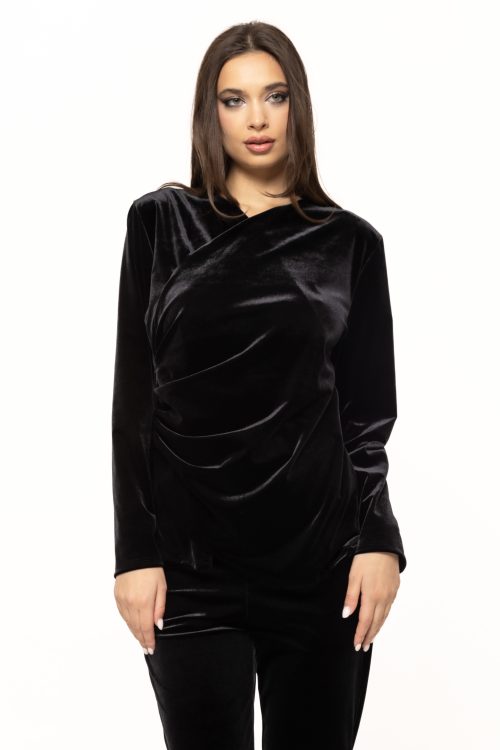 Materialul din catifea este unul dintre elementele centrale care definesc frumusețea bluzei Rosalia. Catifeaua este asociată dintotdeauna cu eleganța și luxul, iar textura sa fină și ușor lucioasă conferă un aspect prețios. Reflexiile discrete ale materialului se schimbă odată cu lumina, ceea ce face bluza deosebit de spectaculoasă la evenimente de seară sau în încăperi cu lumină caldă. Este un articol care arată impecabil în fotografii și creează instant acel efect “glam” discret, dar vizibil.