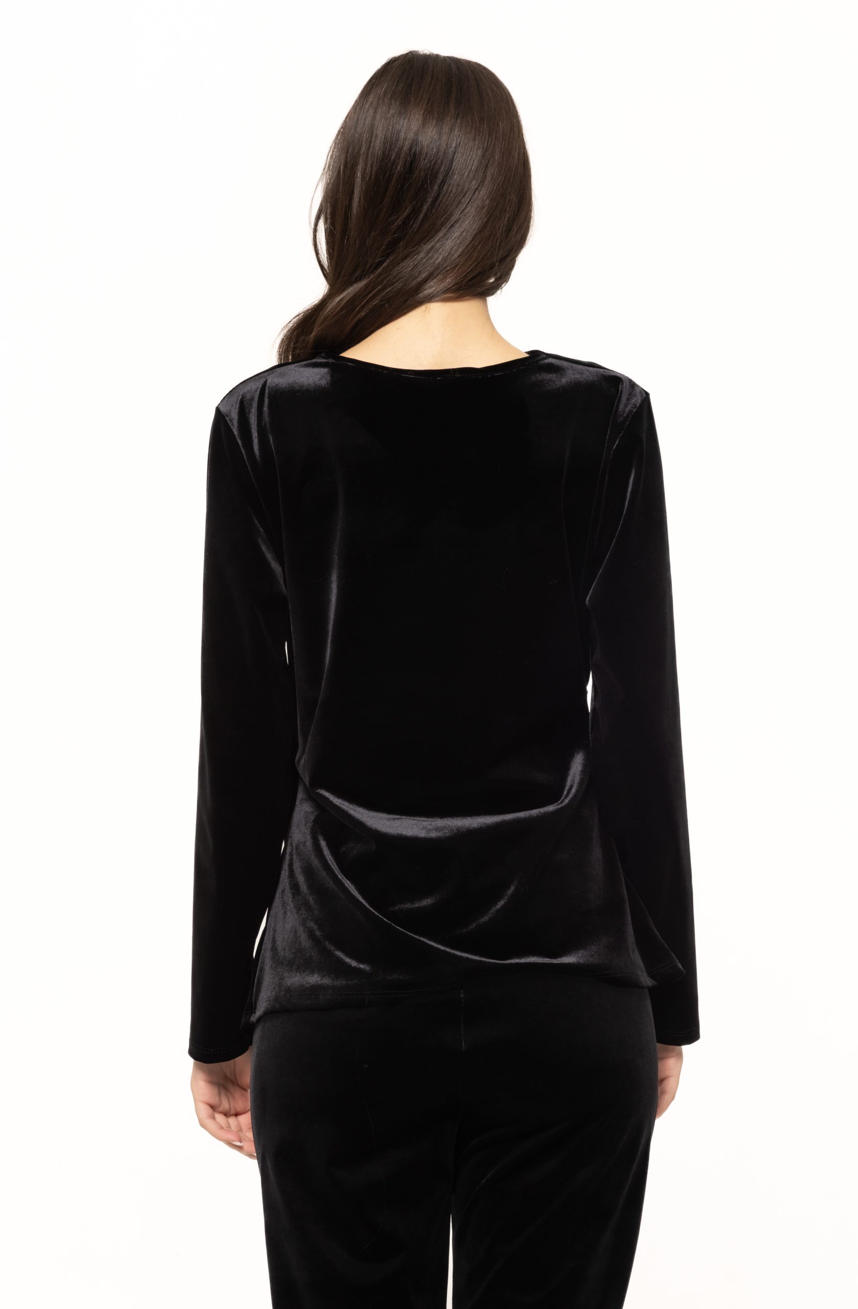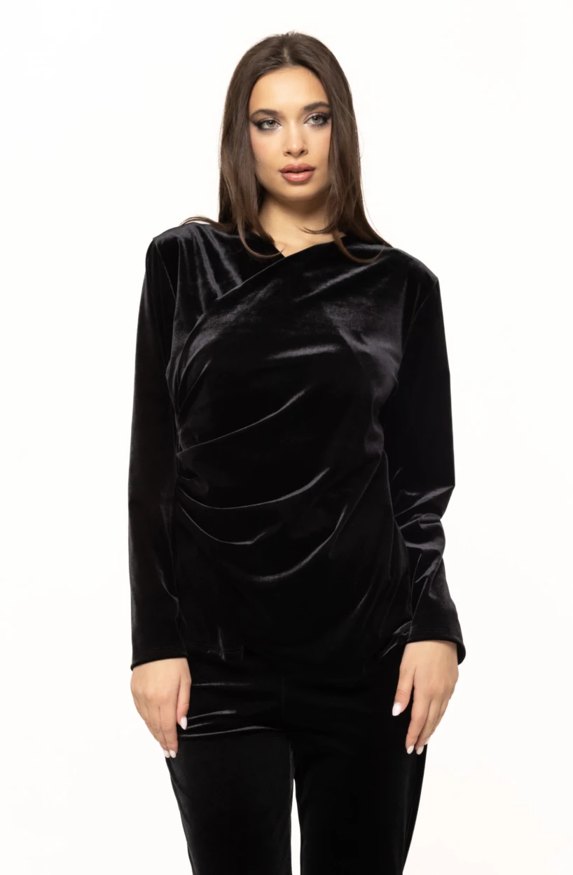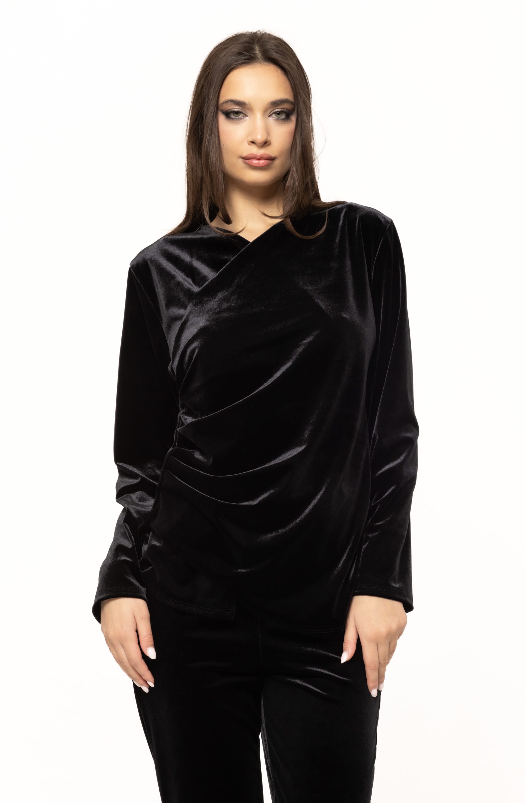 Materialul din catifea este unul dintre elementele centrale care definesc frumusețea bluzei Rosalia. Catifeaua este asociată dintotdeauna cu eleganța și luxul, iar textura sa fină și ușor lucioasă conferă un aspect prețios. Reflexiile discrete ale materialului se schimbă odată cu lumina, ceea ce face bluza deosebit de spectaculoasă la evenimente de seară sau în încăperi cu lumină caldă. Este un articol care arată impecabil în fotografii și creează instant acel efect “glam” discret, dar vizibil.