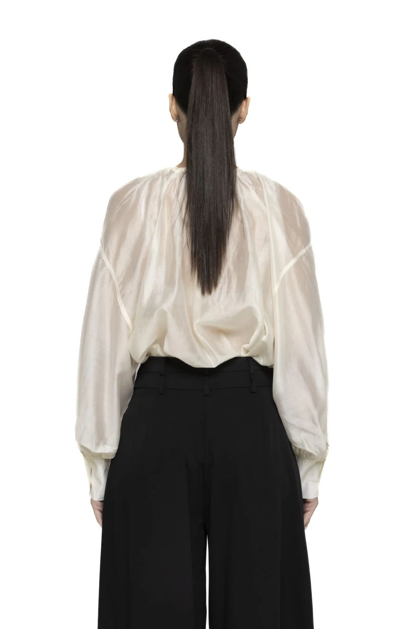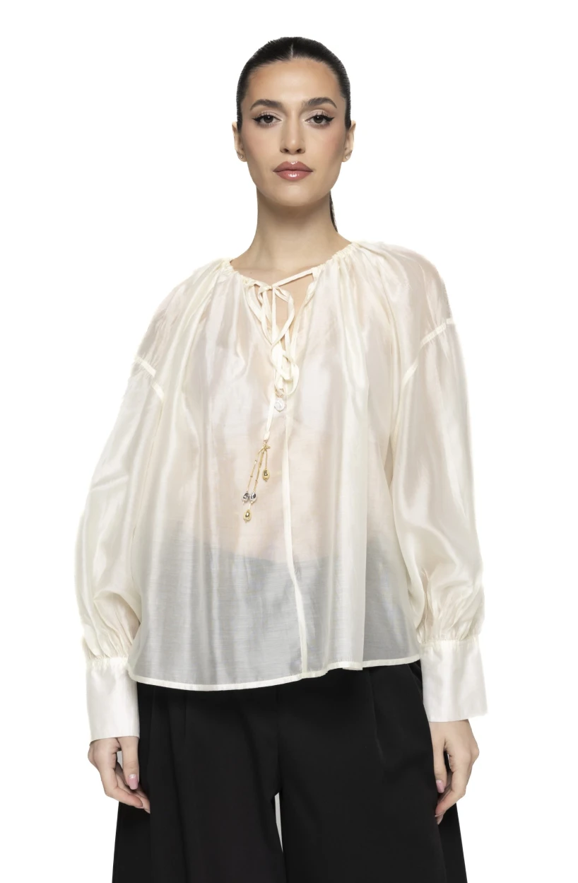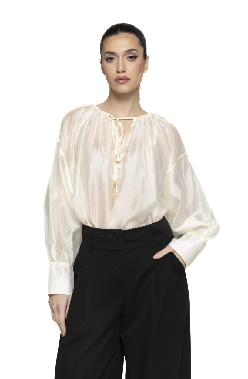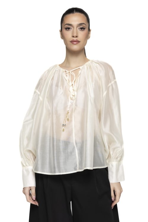 Croiala acestei bluze transparente cu șnur Luiza este gândită pentru a avantaja diverse tipuri de siluetă. Linia fluidă cade natural pe corp, creând un efect elegant și feminin. Poate fi purtată peste un top simplu sau un body, oferind multiple variante de styling în funcție de ocazie. Astfel, devine o piesă ideală pentru layering, permițându-ți să creezi outfituri interesante și moderne.