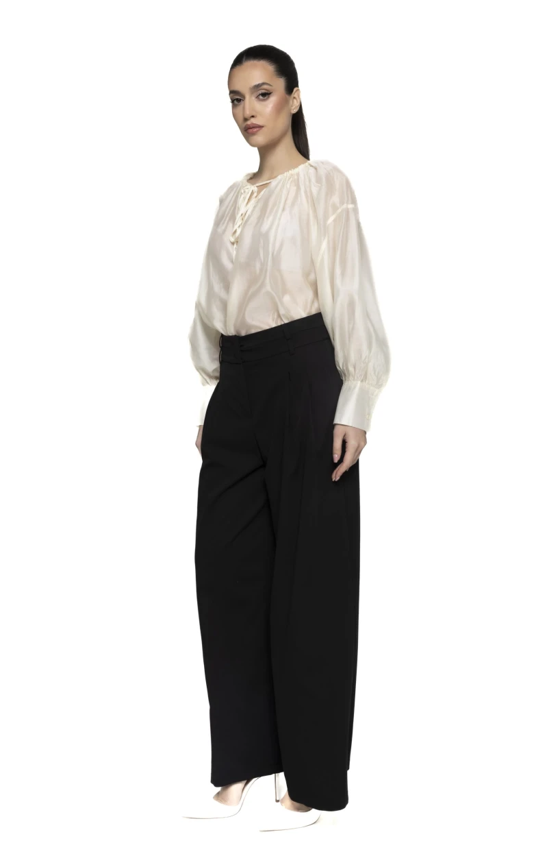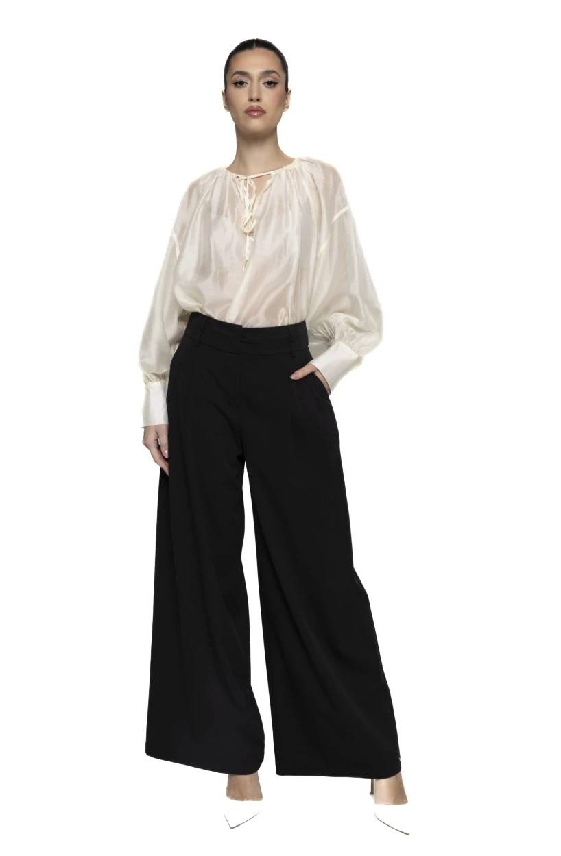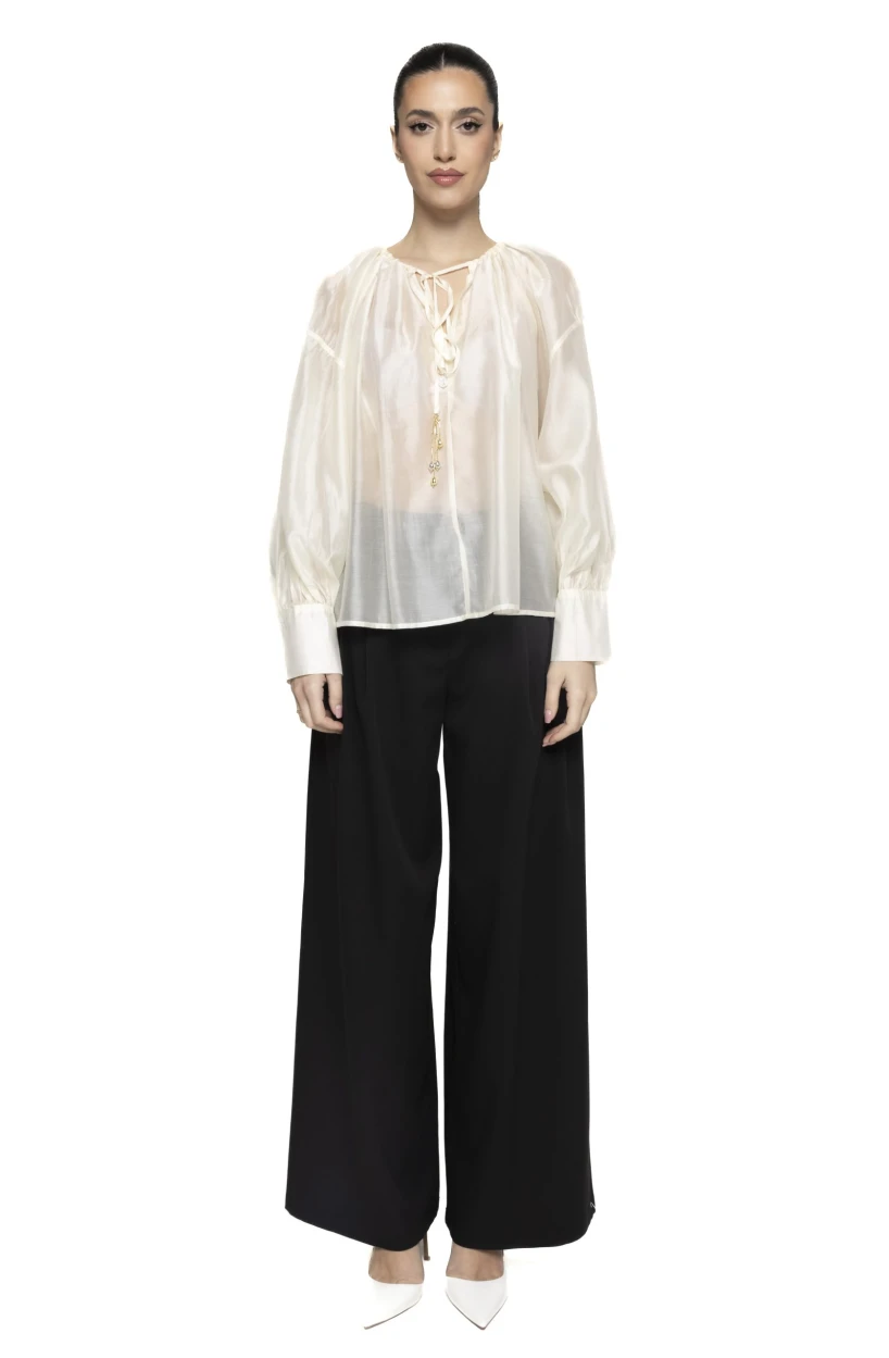 Versatilitatea este unul dintre cele mai importante avantaje ale acestei bluze transparente cu șnur Luiza. Pentru o ținută casual, o poți combina cu jeanși și pantofi sport, obținând un look relaxat, dar stilat. Pentru un outfit mai elegant, alege o fustă conică sau pantaloni cu talie înaltă și completează cu o pereche de pantofi cu toc. În același timp, pentru evenimente speciale, această bluză poate fi accesorizată cu bijuterii fine și purtată într-o combinație sofisticată.