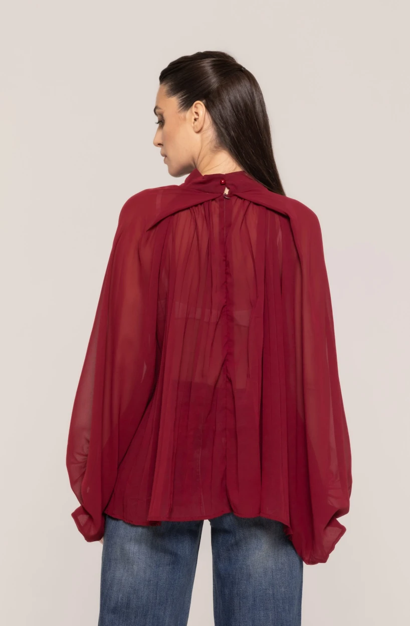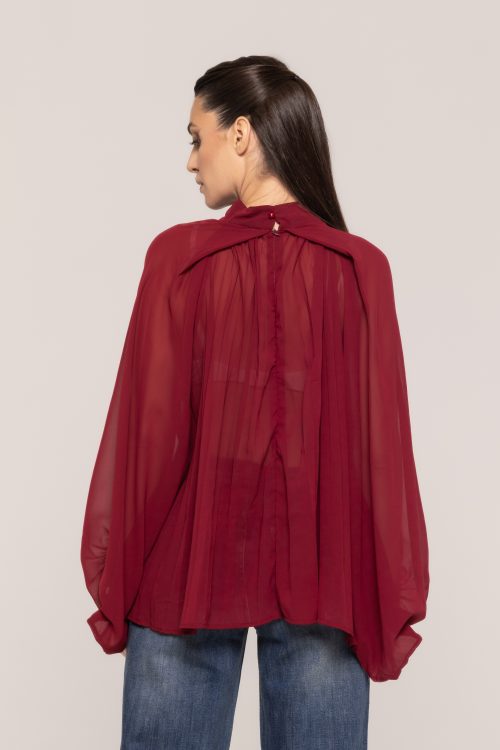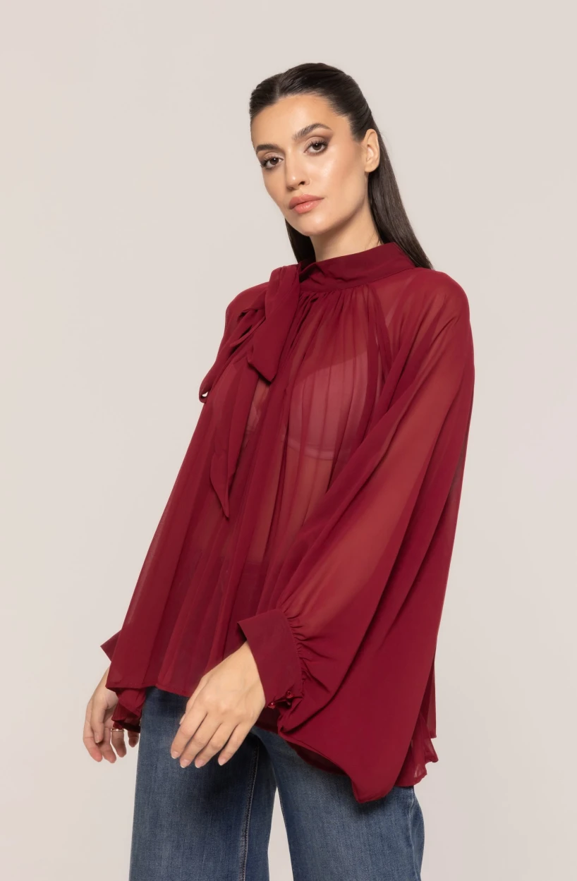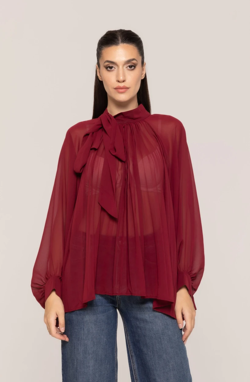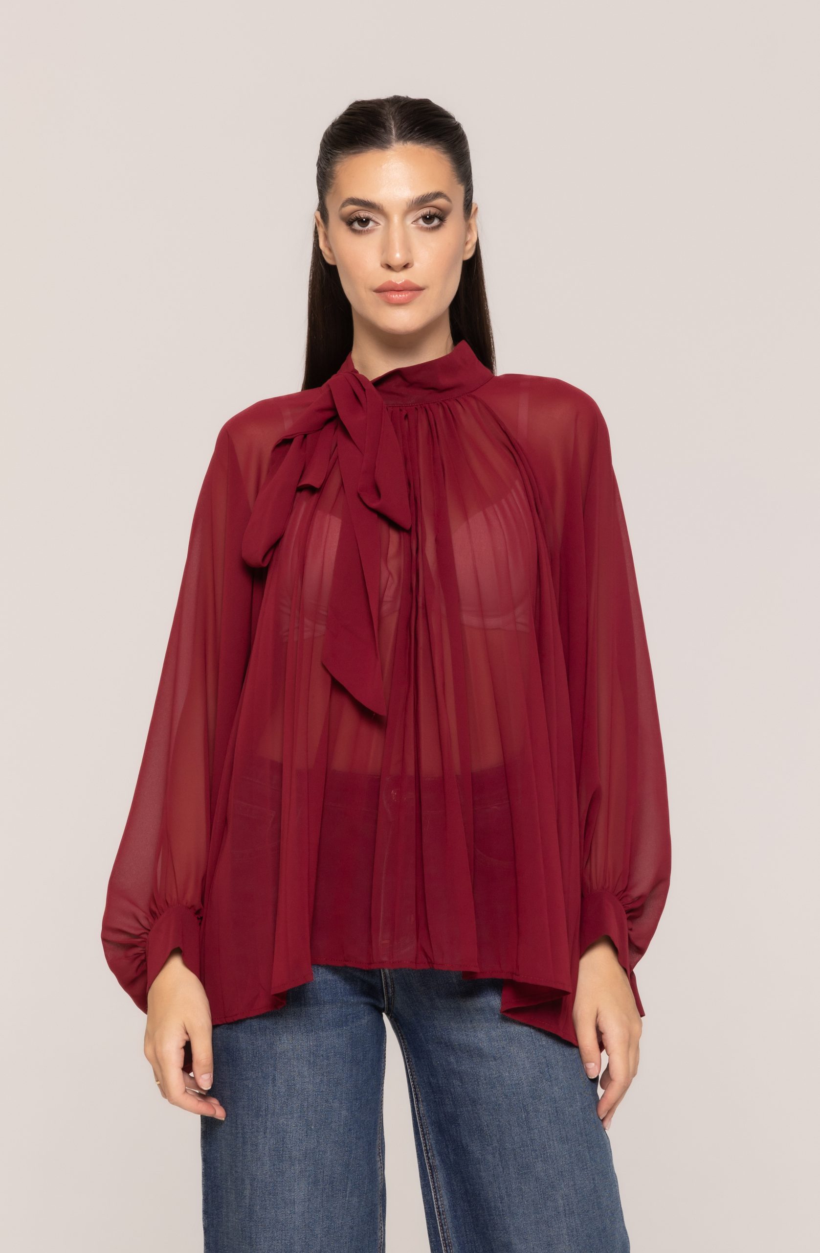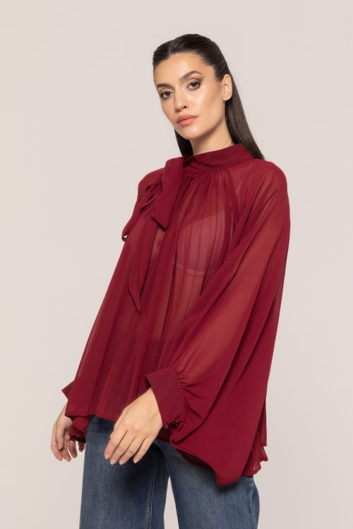 Croiala lejeră a acestei bluze avantajează toate tipurile de siluetă. Materialul vaporos și linia fluidă maschează micile imperfecțiuni și oferă un aspect elegant și rafinat. Funda de la gât atrage atenția asupra zonei superioare a corpului, punând în valoare chipul și linia gâtului. În același timp, transparența subtilă adaugă un efect seducător, fără a fi ostentativ.