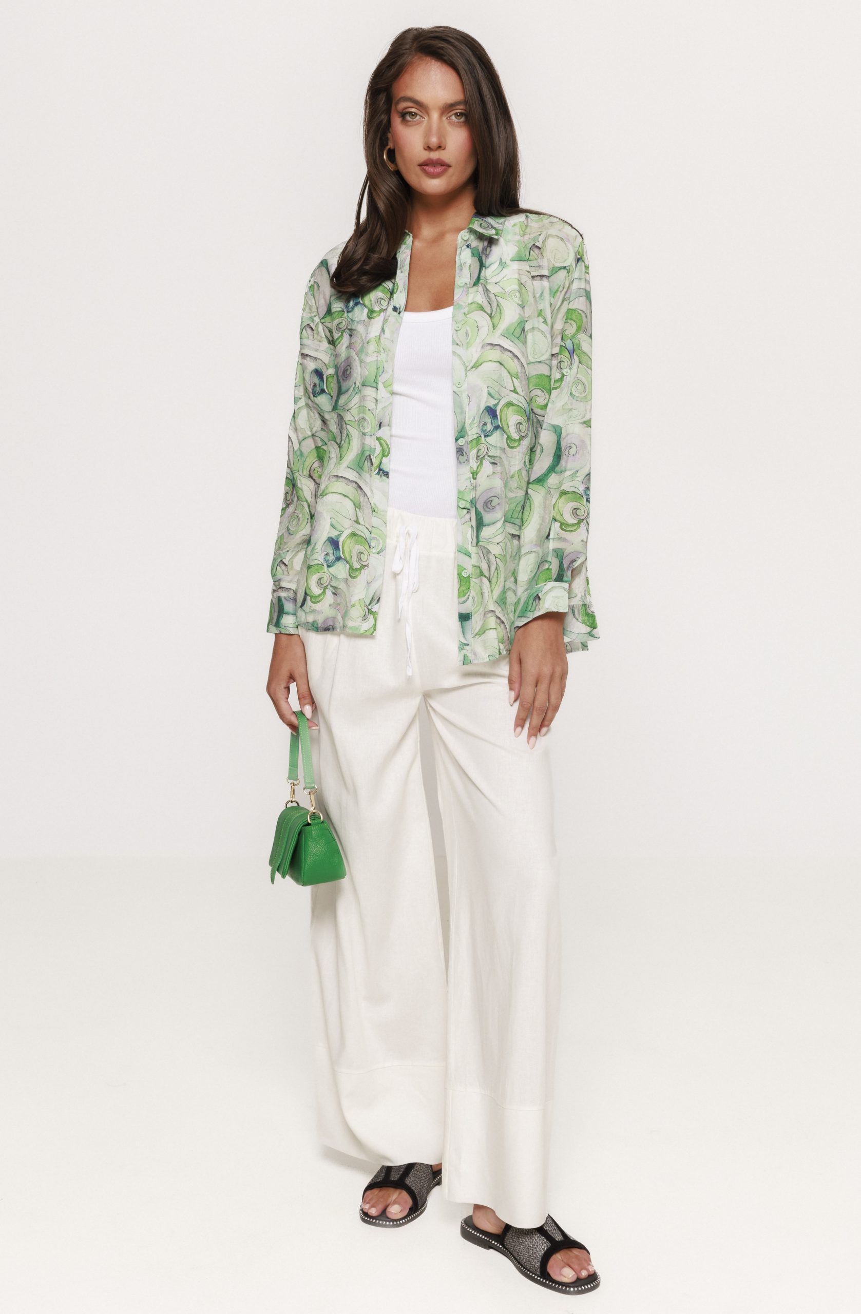 Designul cămășii cu diferite imprimeuri Angi este unul aparte, datorită combinației de forme și linii care creează un efect vizual dinamic. Imprimeurile sunt atent integrate, oferind un echilibru între modern și artistic. Nuanțele de verde, completate de tonuri neutre, fac ca această piesă să fie ușor de asortat, dar în același timp suficient de statement pentru a atrage atenția.