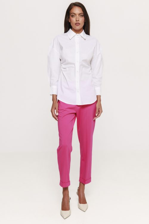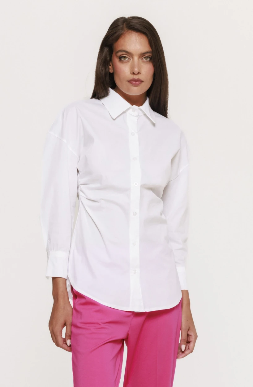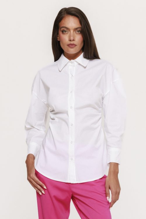 Materialul din care este realizată cămașa cu fronseu lateral Doroty este ales cu grijă pentru a asigura atât confortul, cât și un aspect impecabil pe parcursul întregii zile. Textura este plăcută la atingere, ușor de purtat și permite pielii să respire. În același timp, materialul își păstrează forma, ceea ce înseamnă că fronseul rămâne bine definit chiar și după mai multe purtări sau spălări.