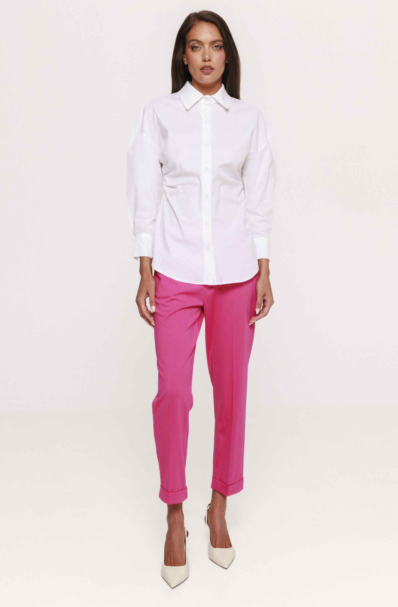 Croiala este gândită astfel încât să avantajeze mai multe tipuri de siluetă. Cămașa cu fronseu lateral Doroty urmărește linia corpului fără a fi prea strâmtă, oferind libertate de mișcare și un aspect armonios. Mânecile și decolteul sunt atent finisate, contribuind la un design echilibrat și modern.