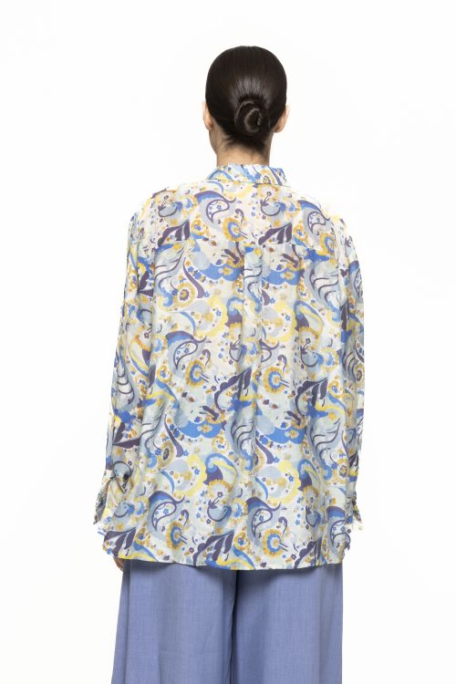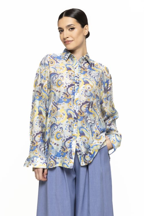 Designul cămășii cu imprimeu Dorina este gândit pentru a avantaja diferite tipuri de siluetă. Linia fluidă se așază armonios pe corp, oferind un efect vizual echilibrat și feminin. Gulerul clasic și închiderea cu nasturi completează designul, iar mânecile lungi adaugă un plus de versatilitate, fiind potrivite pentru diverse combinații vestimentare.