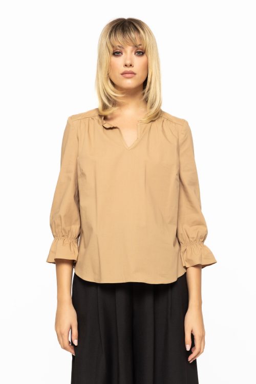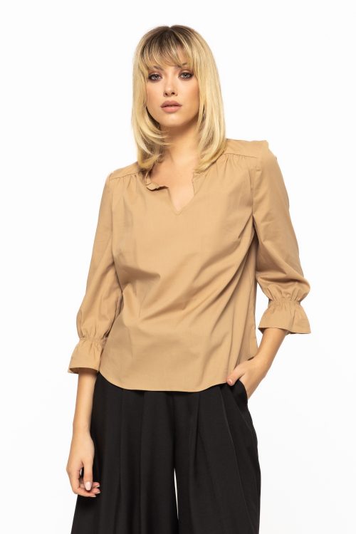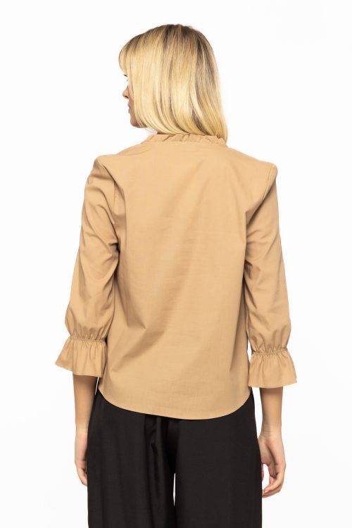 Mâneca trei sferturi este elementul-cheie al acestei cămăși – un detaliu practic, dar în același timp extrem de elegant. Lungimea până sub cot conferă libertate de mișcare și o notă de feminitate subtilă, ideală pentru sezoanele de tranziție sau pentru zilele în care nu vrei să porți mânecă lungă. Poți rula ușor manșetele pentru un look casual sau le poți lăsa drepte pentru un aer rafinat și profesional.
