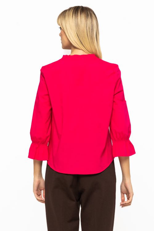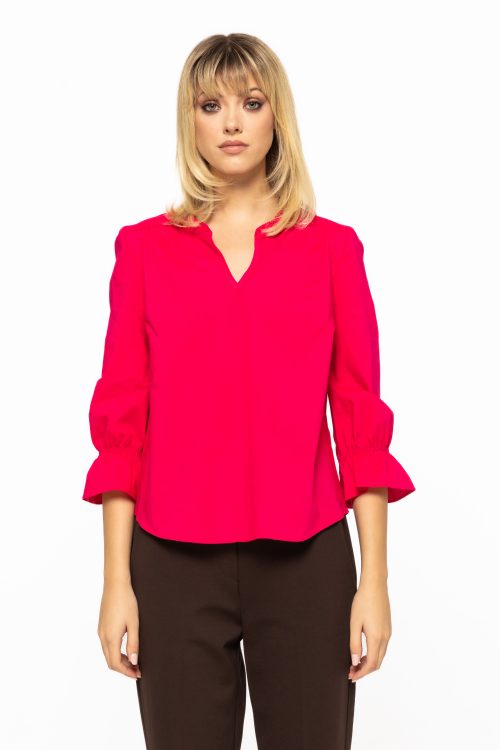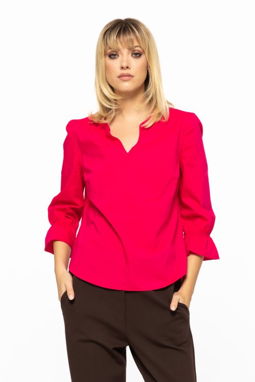 Mâneca trei sferturi este elementul-cheie al acestei cămăși – un detaliu practic, dar în același timp extrem de elegant. Lungimea până sub cot conferă libertate de mișcare și o notă de feminitate subtilă, ideală pentru sezoanele de tranziție sau pentru zilele în care nu vrei să porți mânecă lungă. Poți rula ușor manșetele pentru un look casual sau le poți lăsa drepte pentru un aer rafinat și profesional.