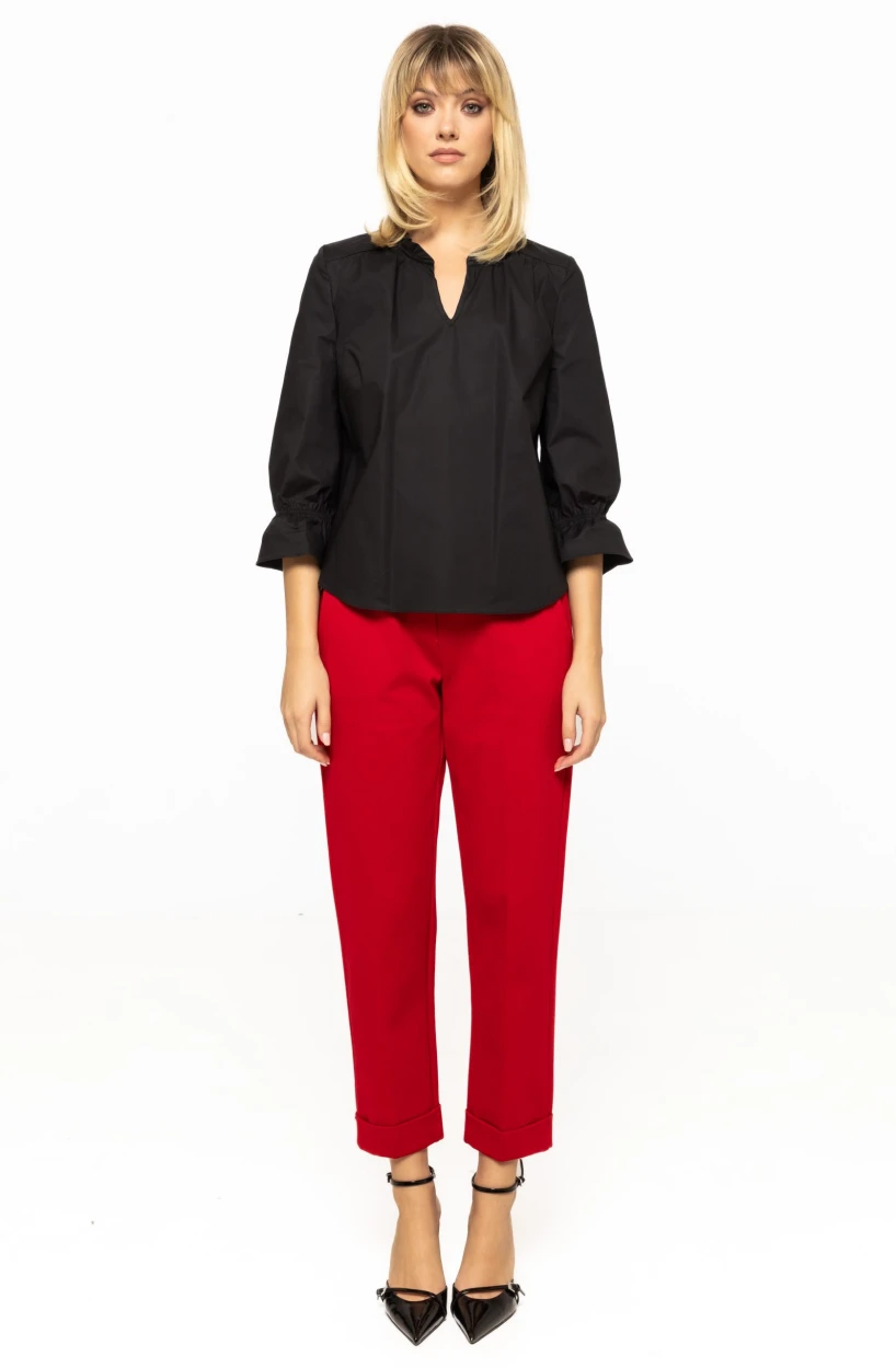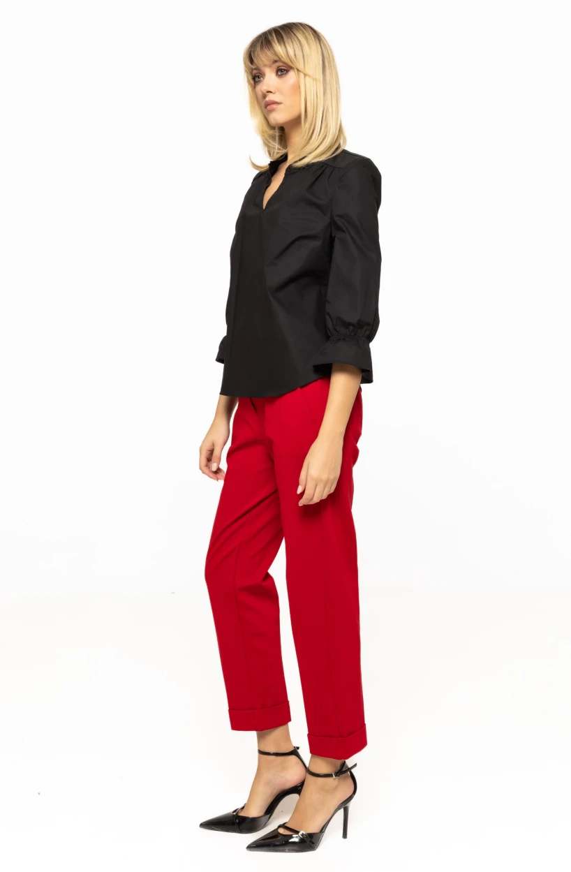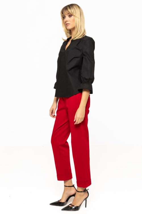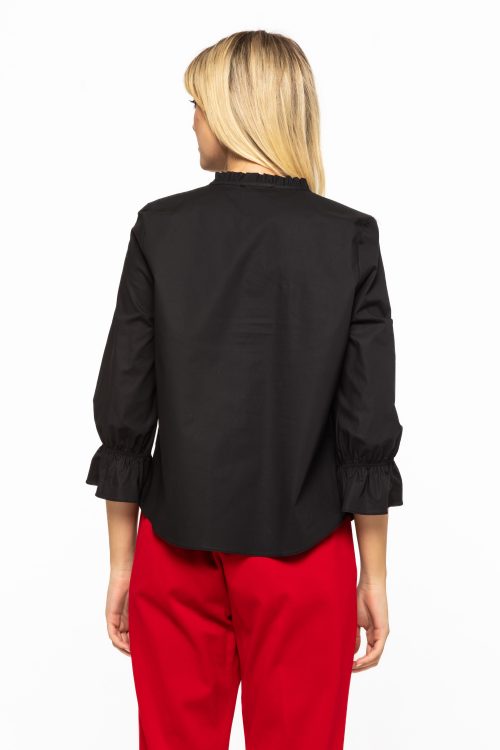 Mâneca trei sferturi este elementul-cheie al acestei cămăși – un detaliu practic, dar în același timp extrem de elegant. Lungimea până sub cot conferă libertate de mișcare și o notă de feminitate subtilă, ideală pentru sezoanele de tranziție sau pentru zilele în care nu vrei să porți mânecă lungă. Poți rula ușor manșetele pentru un look casual sau le poți lăsa drepte pentru un aer rafinat și profesional.