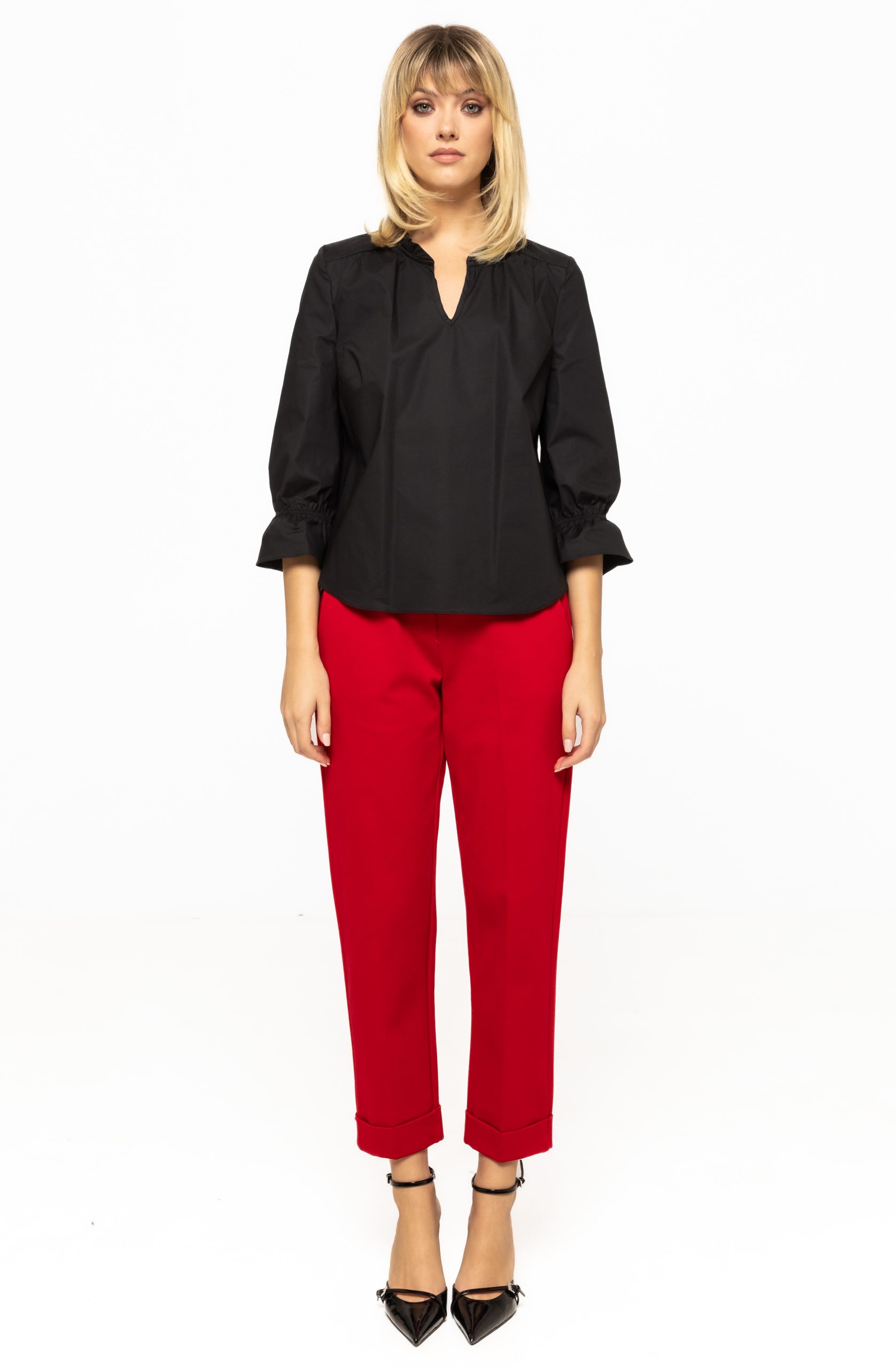 Mâneca trei sferturi este elementul-cheie al acestei cămăși – un detaliu practic, dar în același timp extrem de elegant. Lungimea până sub cot conferă libertate de mișcare și o notă de feminitate subtilă, ideală pentru sezoanele de tranziție sau pentru zilele în care nu vrei să porți mânecă lungă. Poți rula ușor manșetele pentru un look casual sau le poți lăsa drepte pentru un aer rafinat și profesional.