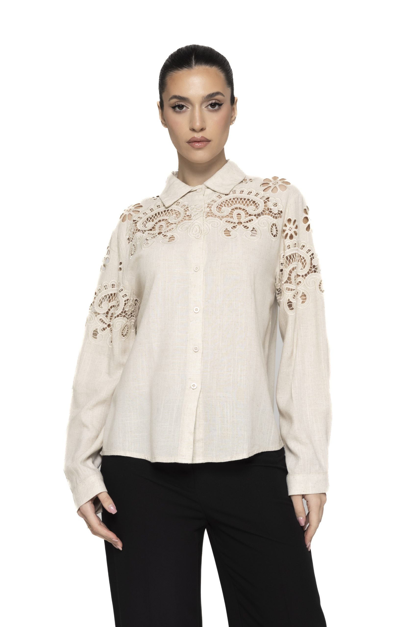 De asemenea, cămașa cu model broderie Talida poate deveni punctul central al unei ținute minimaliste, fiind suficient de expresivă încât să nu necesite accesorii elaborate. O pereche de cercei discreți și o geantă simplă sunt suficiente pentru a completa outfitul, lăsând detaliile brodate să iasă în evidență.