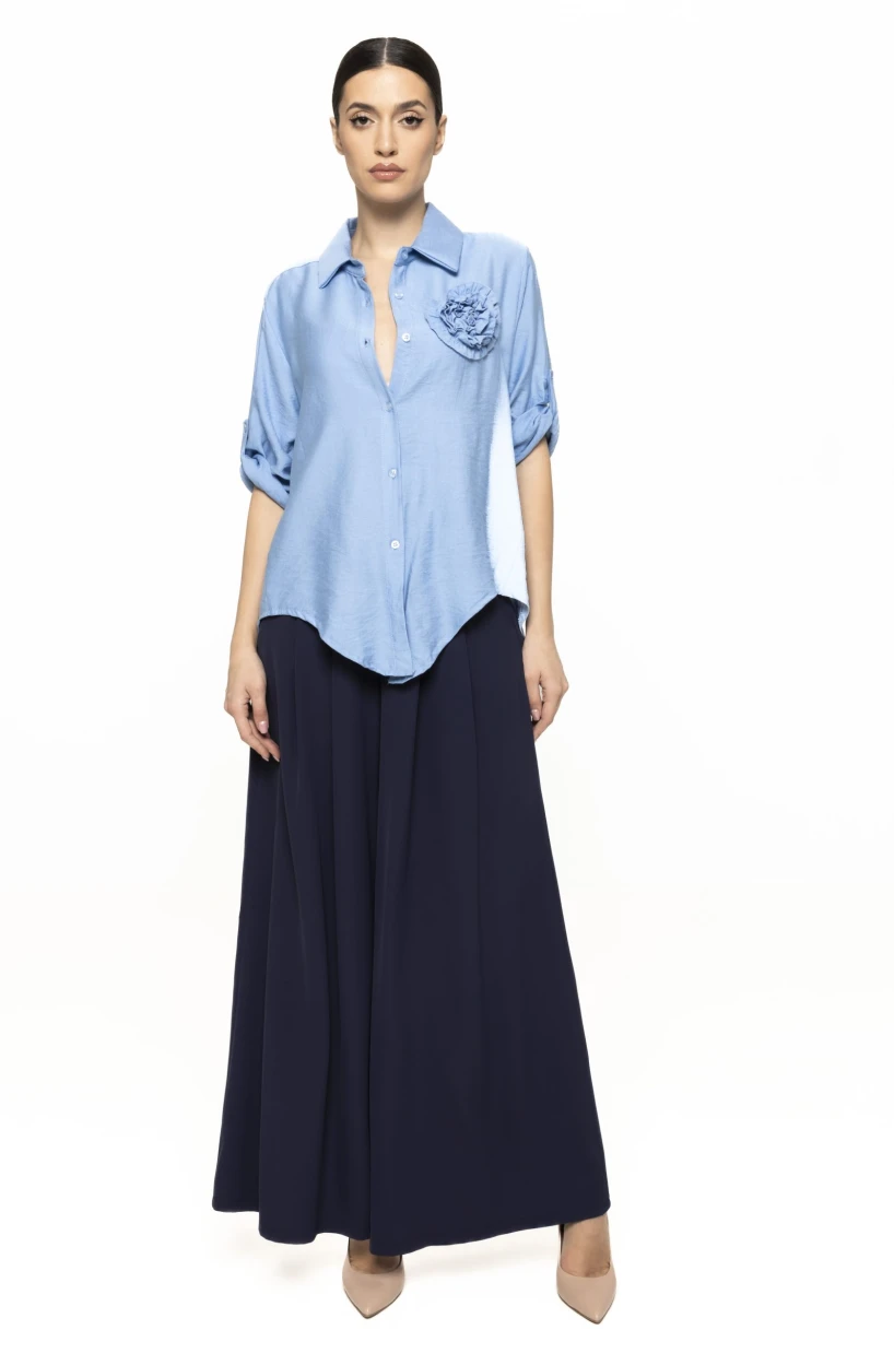 Unul dintre cele mai mari avantaje ale acestei cămăși este versatilitatea. Poate fi purtată cu pantaloni conici pentru un look office rafinat, cu jeans pentru o apariție casual-chic sau cu o fustă midi pentru un outfit romantic. Floarea aplicată în zona pieptului elimină nevoia unor accesorii statement, deoarece piesa în sine devine elementul central al ținutei. Totuși, poate fi completată cu bijuterii fine, pentru un plus de eleganță.