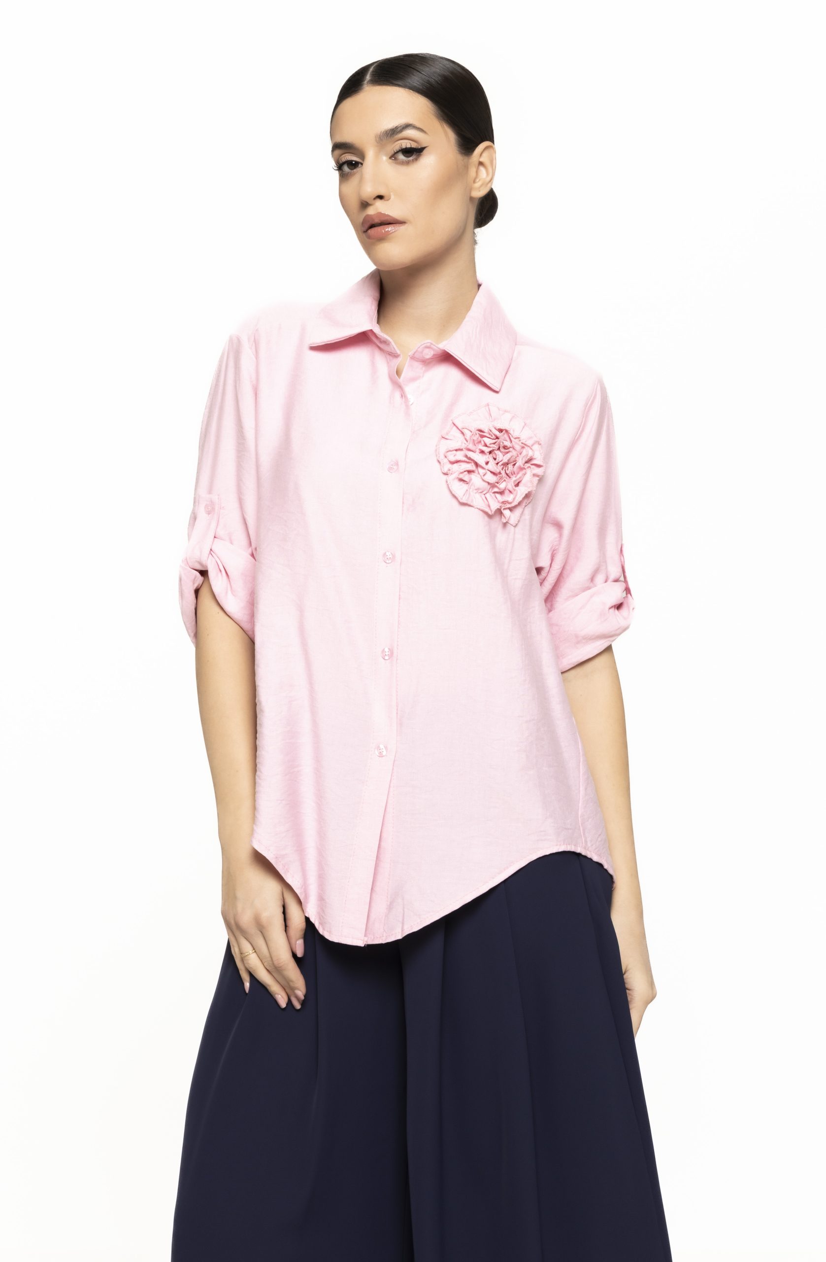 Unul dintre cele mai mari avantaje ale acestei cămăși este versatilitatea. Poate fi purtată cu pantaloni conici pentru un look office rafinat, cu jeans pentru o apariție casual-chic sau cu o fustă midi pentru un outfit romantic. Floarea aplicată în zona pieptului elimină nevoia unor accesorii statement, deoarece piesa în sine devine elementul central al ținutei. Totuși, poate fi completată cu bijuterii fine, pentru un plus de eleganță.