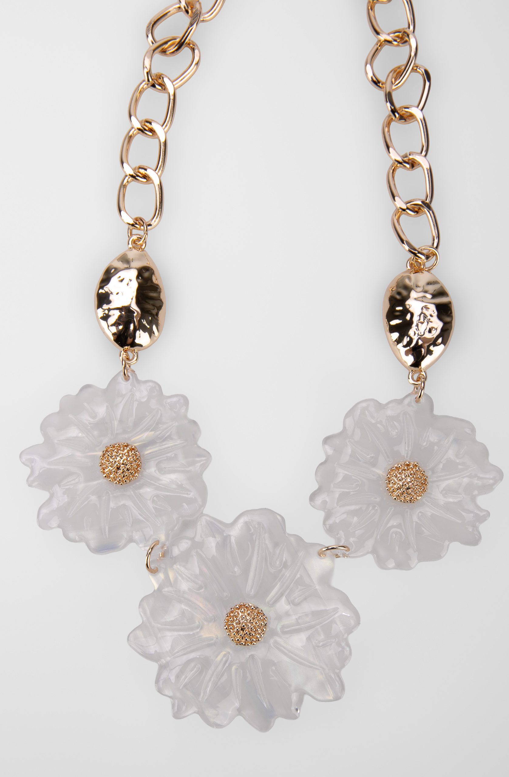 Colierul este susținut de un lanț auriu cu zale moderne, care adaugă un aer contemporan designului. Tonul auriu completează armonios nuanța albă a florilor, oferind un contrast rafinat.