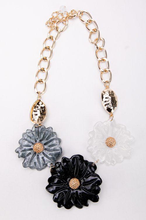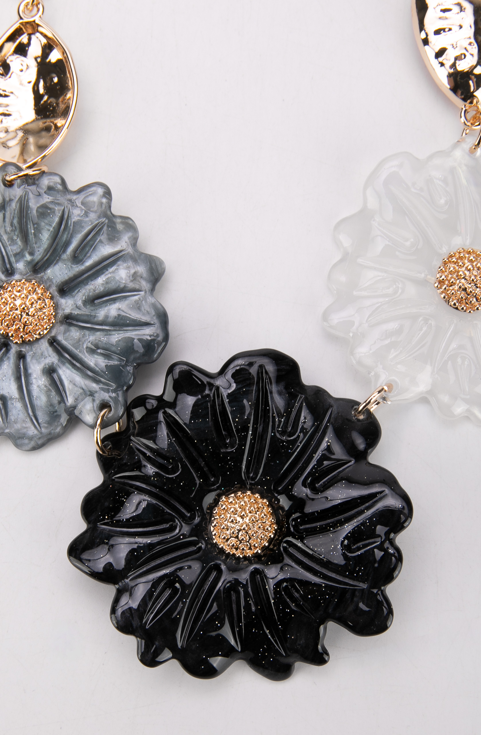 Elementul central al colierului Wendy îl reprezintă aplicațiile florale supradimensionate, cu un design delicat și detalii atent lucrate. Florile albe, cu centru auriu texturat, creează un contrast elegant și echilibrat.