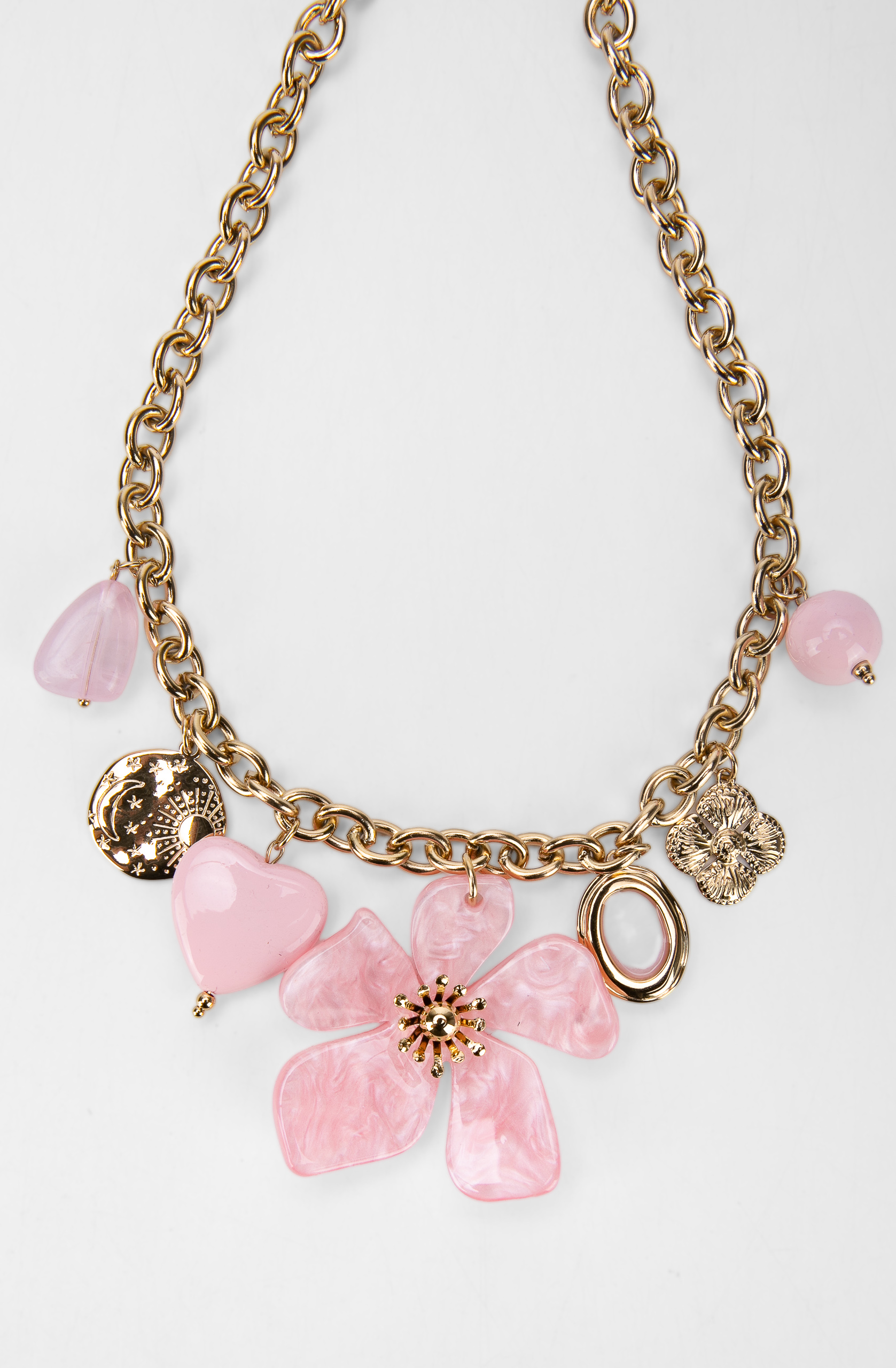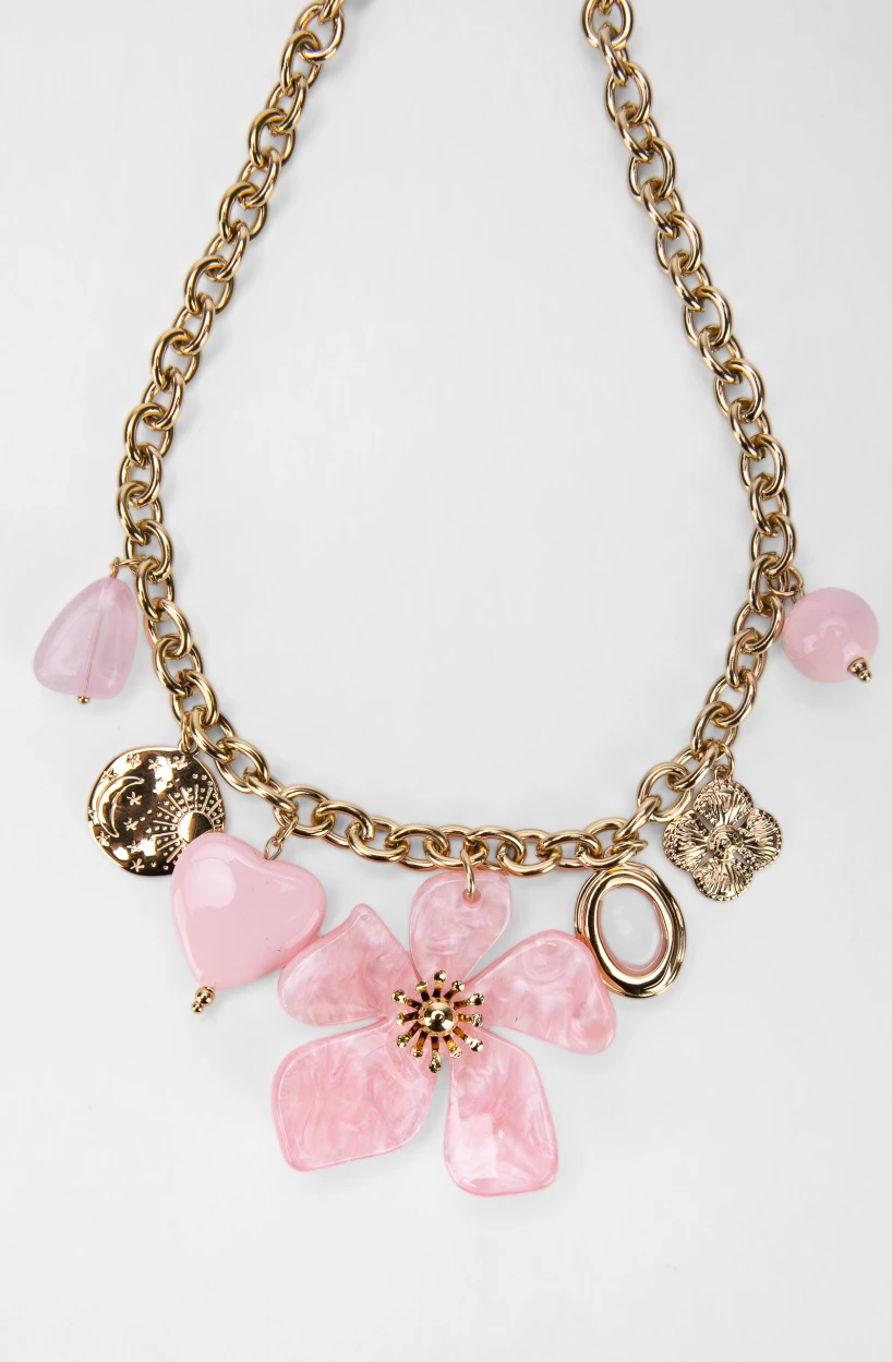 Elementul central al colierului Teo este floarea maxi cu petale sidefate în tonuri calde, care reflectă delicat lumina și oferă profunzime designului. În jurul acesteia, pandantivele variate – inimă, disc decorativ, floare metalică și elemente rotunde – creează un joc vizual dinamic, fără a încărca excesiv piesa.