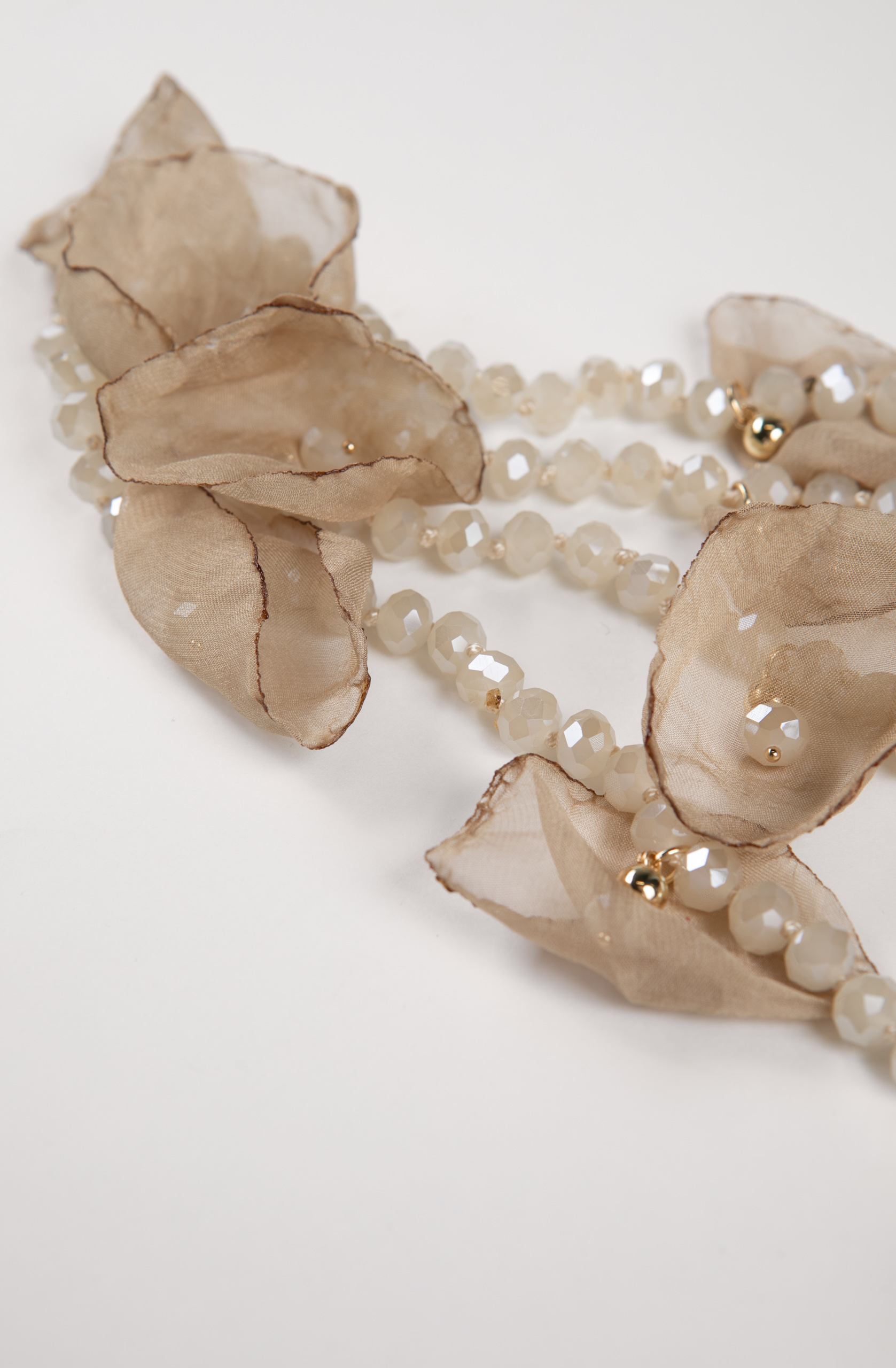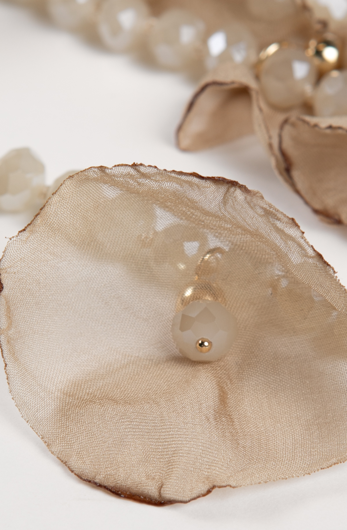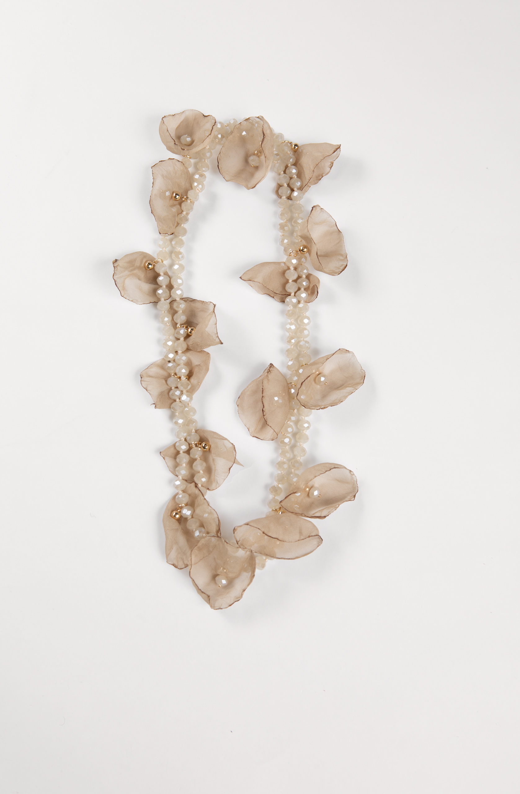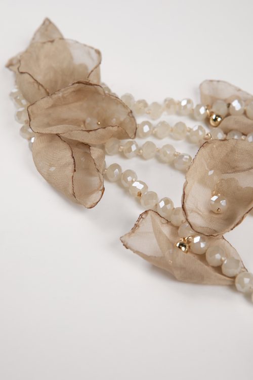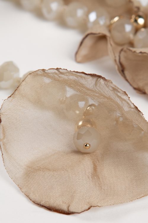 Elementul central al acestui colier floral Simona este reprezentat de aplicațiile florale realizate din voal fin, într-o nuanță caldă de crem. Petalele sunt atent conturate și dispuse astfel încât să creeze volum și mișcare, oferind un aspect natural și elegant. Aceste detalii sunt completate de mărgelele sidefate, care adaugă un plus de strălucire subtilă și rafinament. Împreună, aceste elemente transformă colierul floral Simona într-o piesă statement, dar în același timp delicată.