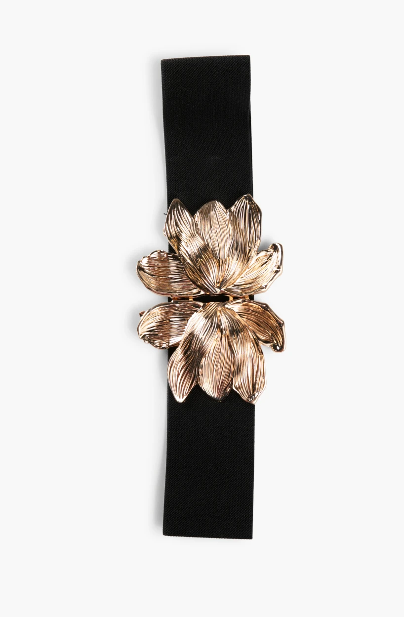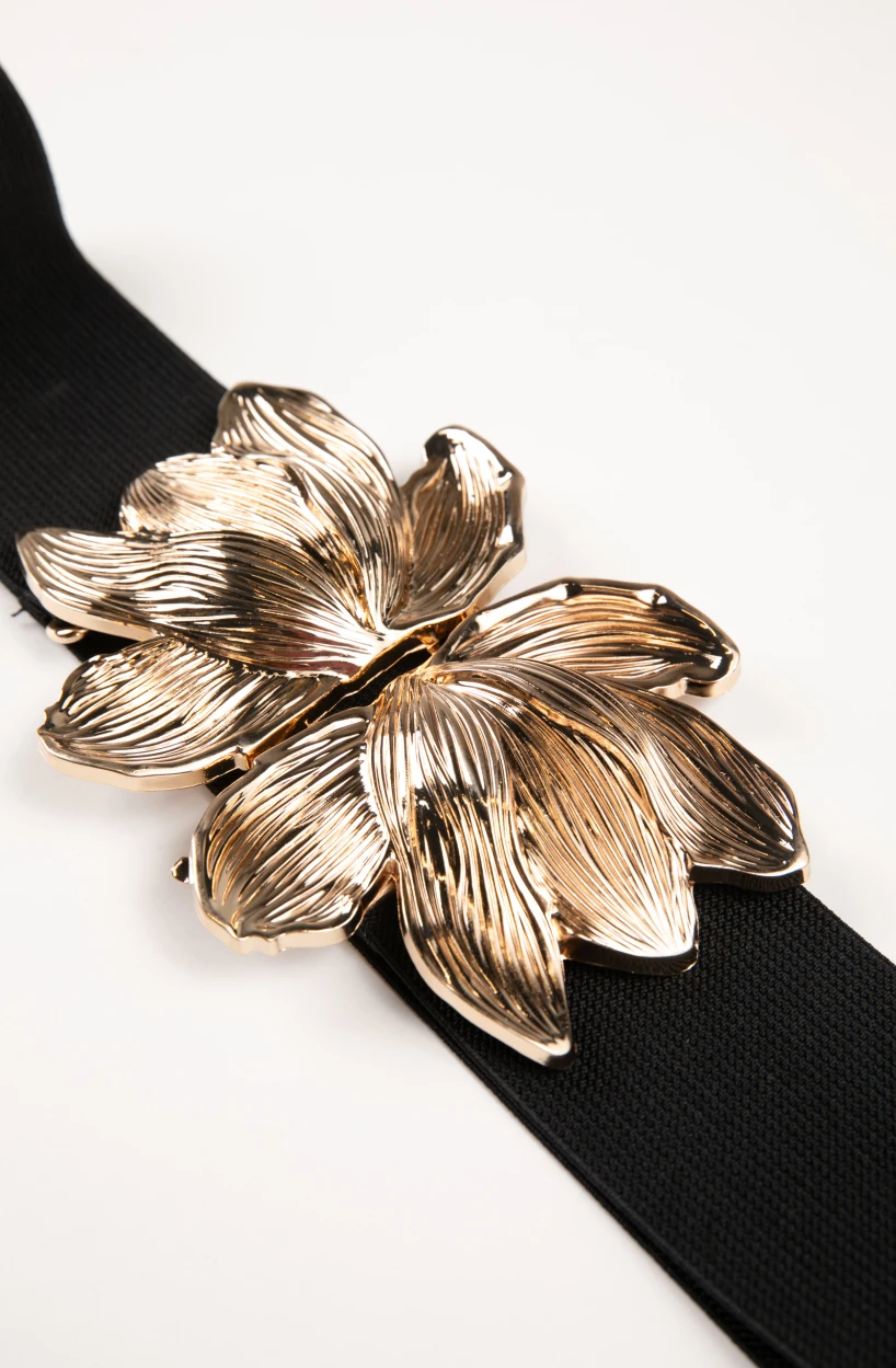 Elementul central al acestei curele cu cataramă model floare April este catarama aurie, inspirată din forma unei flori stilizate. Designul său sculptural, cu finisaj lucios, reflectă subtil lumina și oferă un efect sofisticat și premium. Forma organică a florii adaugă un aer romantic și feminin, fiind în același timp suficient de modernă pentru a se integra în tendințele actuale. Această curea cu cataramă model floare April devine astfel punctul de atracție al ținutei, fără a fi exagerată.
