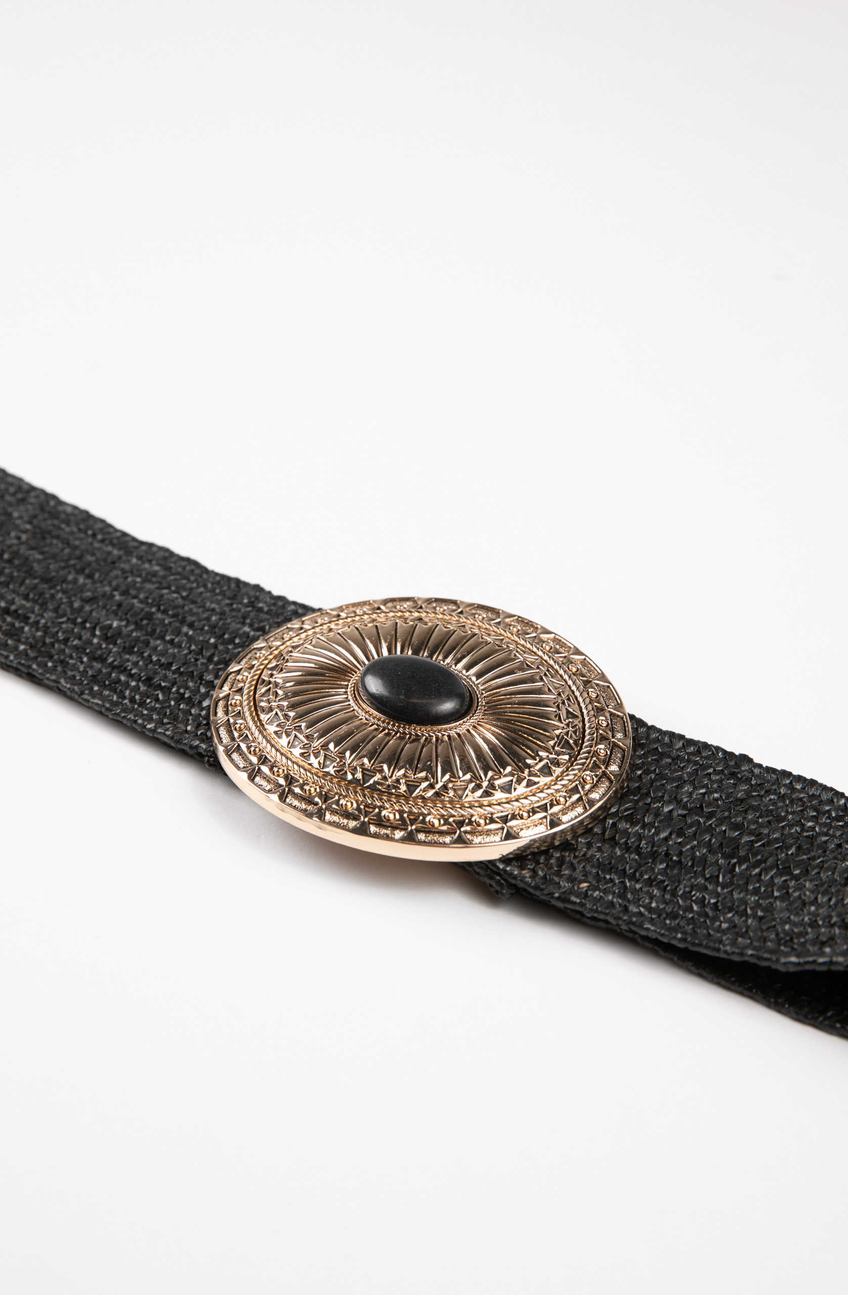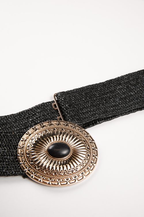Elementul definitoriu al acestei curele cu cataramă ovală Catalina este catarama decorativă de dimensiuni generoase, cu formă ovală și finisaj auriu. Designul său complex, inspirat din motive vintage și influențe boho, este completat de inserția centrală în tonuri deschise, care oferă un contrast elegant și sofisticat. Această cataramă transformă cureaua cu cataramă ovală Catalina într-un accesoriu statement, capabil să atragă imediat atenția.