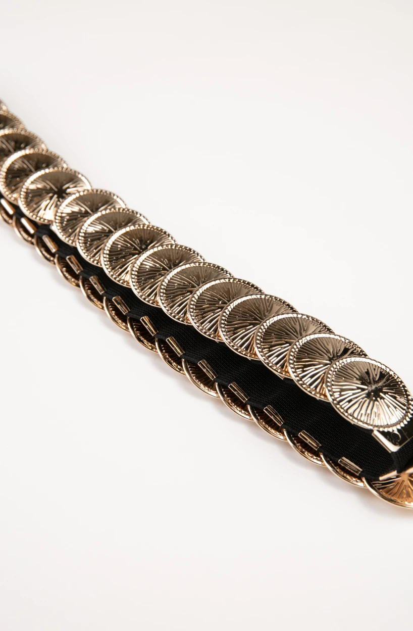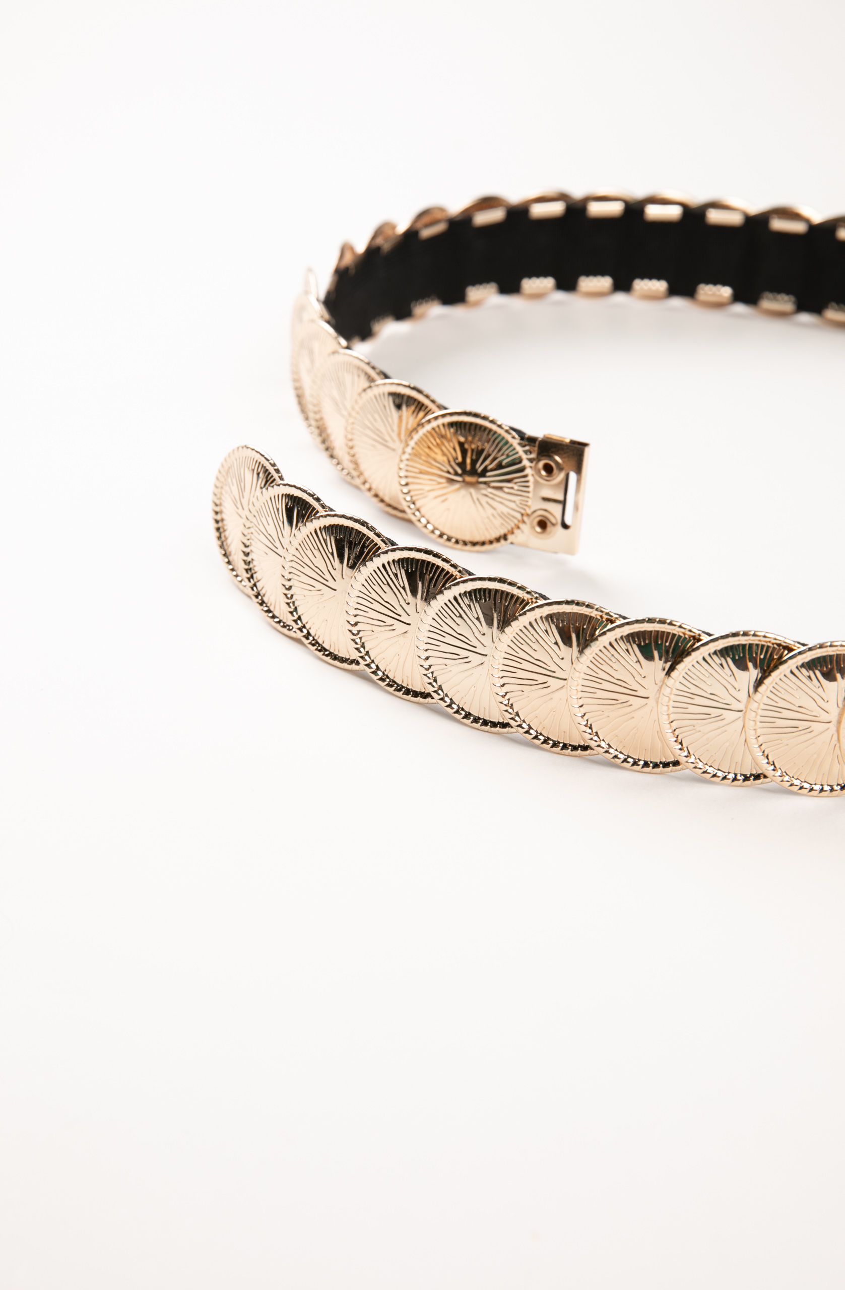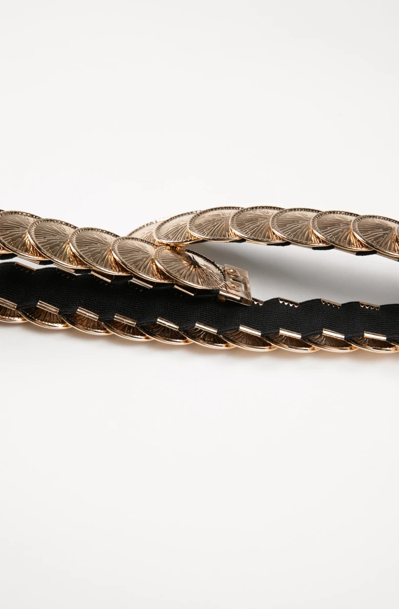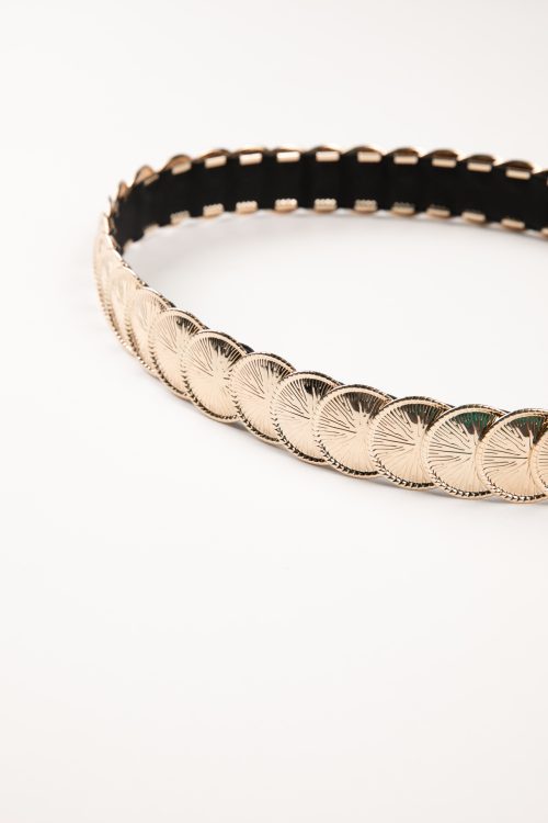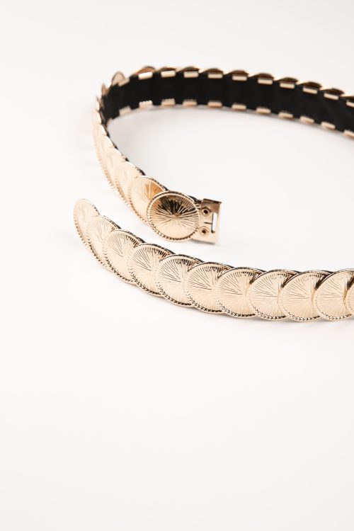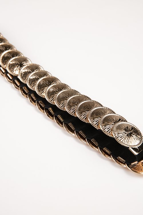 Curea cu model bănuți Sorana se remarcă prin echilibrul perfect între simplitate și efect vizual. Discurile metalice creează un joc subtil de lumină și mișcare, oferind un plus de dinamism ținutei. Materialul elastic asigură confort și flexibilitate, iar finisajele atent realizate contribuie la durabilitatea produsului.