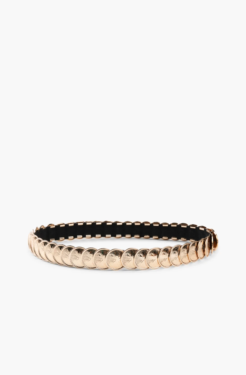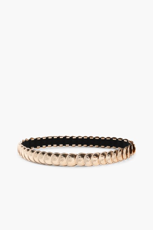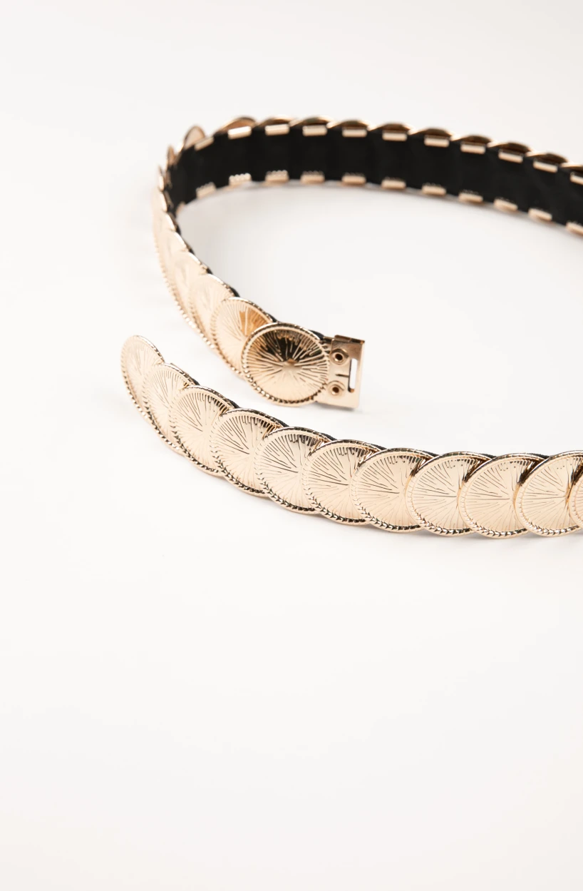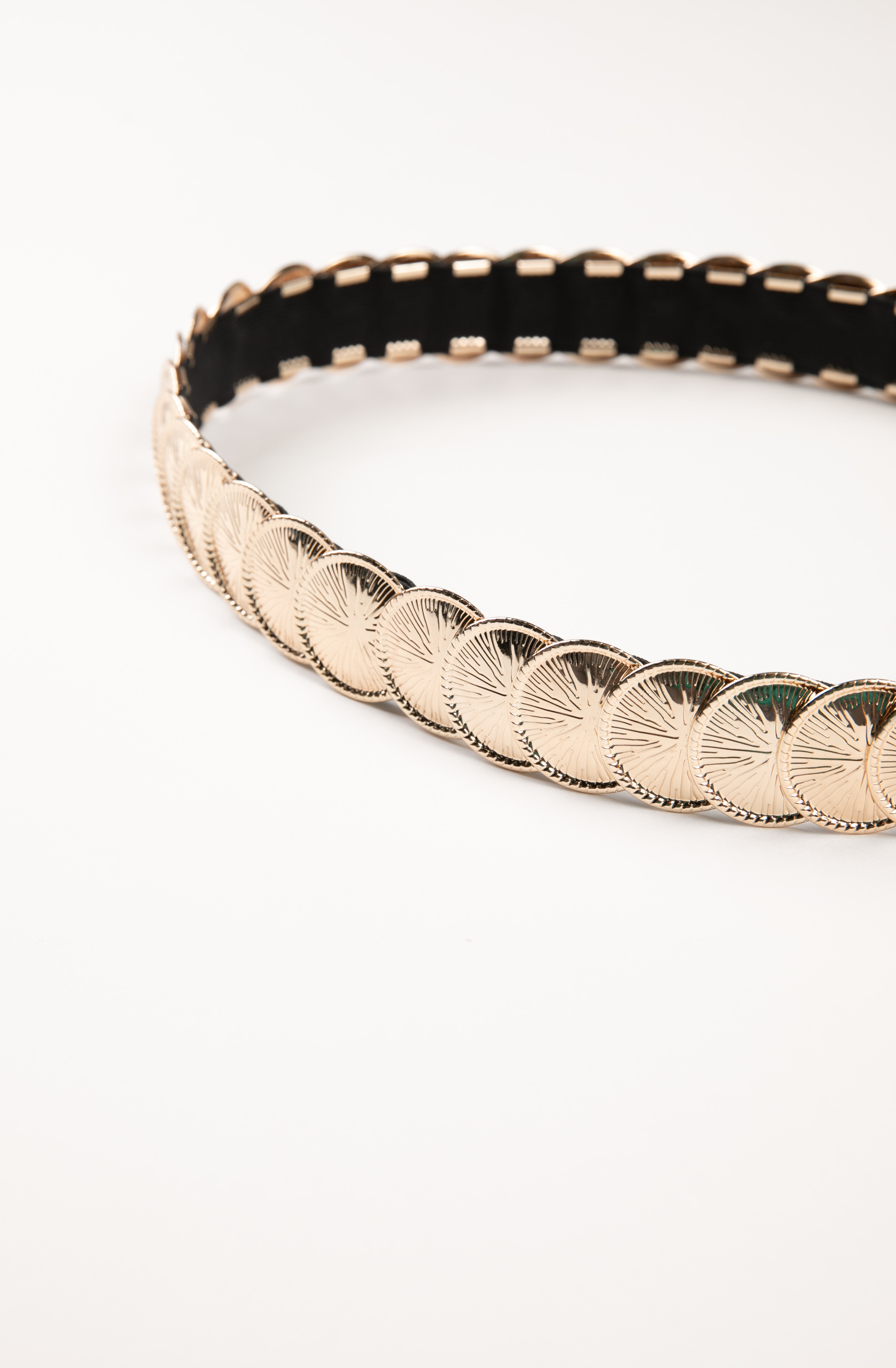 Curea cu model bănuți Sorana se remarcă prin echilibrul perfect între simplitate și efect vizual. Discurile metalice creează un joc subtil de lumină și mișcare, oferind un plus de dinamism ținutei. Materialul elastic asigură confort și flexibilitate, iar finisajele atent realizate contribuie la durabilitatea produsului.