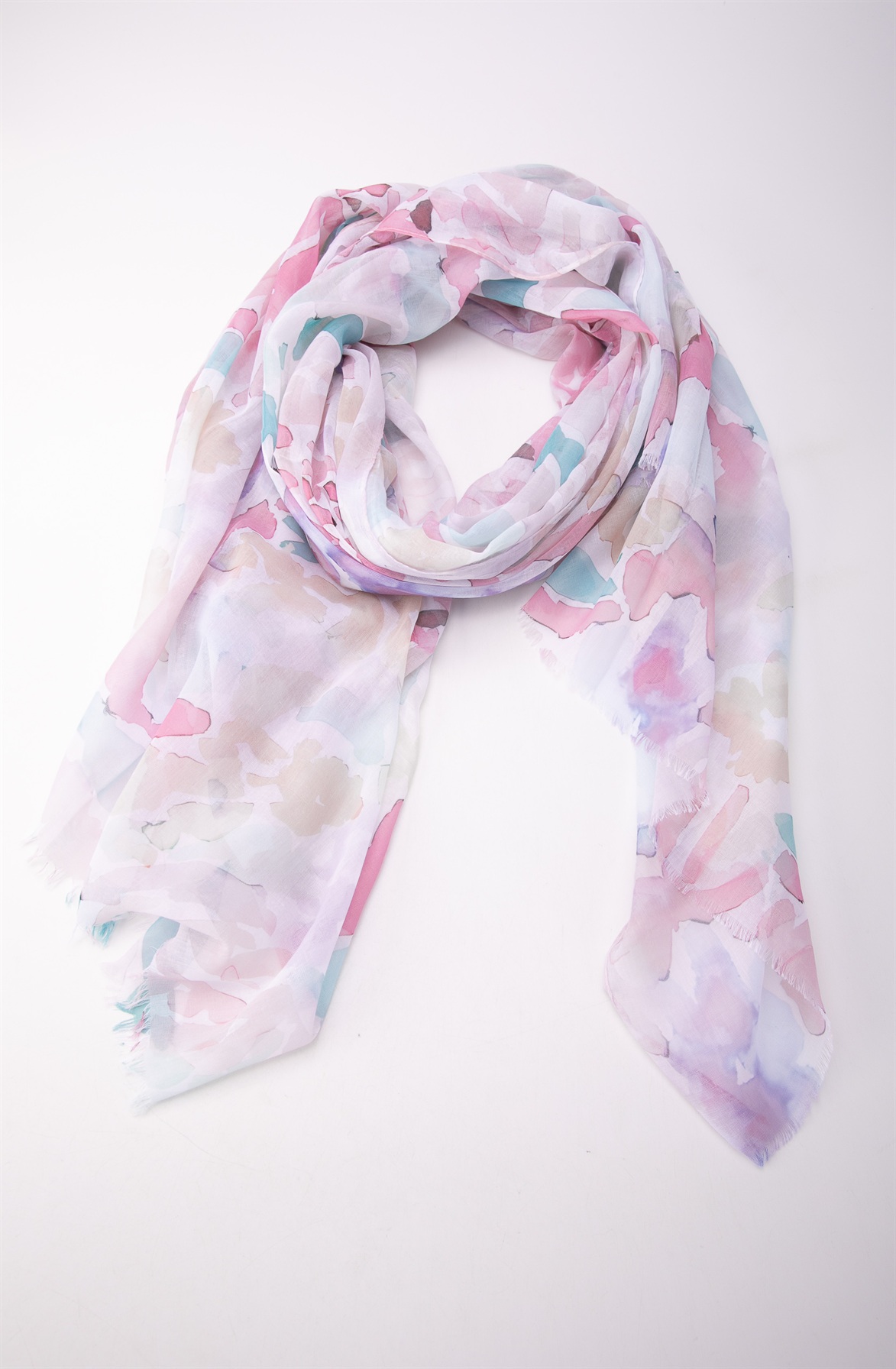 Elementul central al eșarfei Sara este imprimeul fluid, în tonuri pastel de verde, bleu, lila și accente subtile roz. Designul inspirat din efectul watercolor creează un look fresh și feminin, perfect pentru ținutele luminoase și naturale.