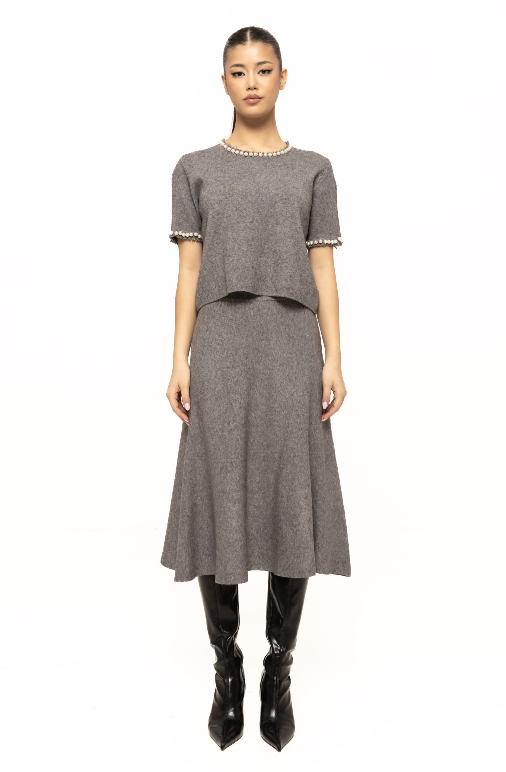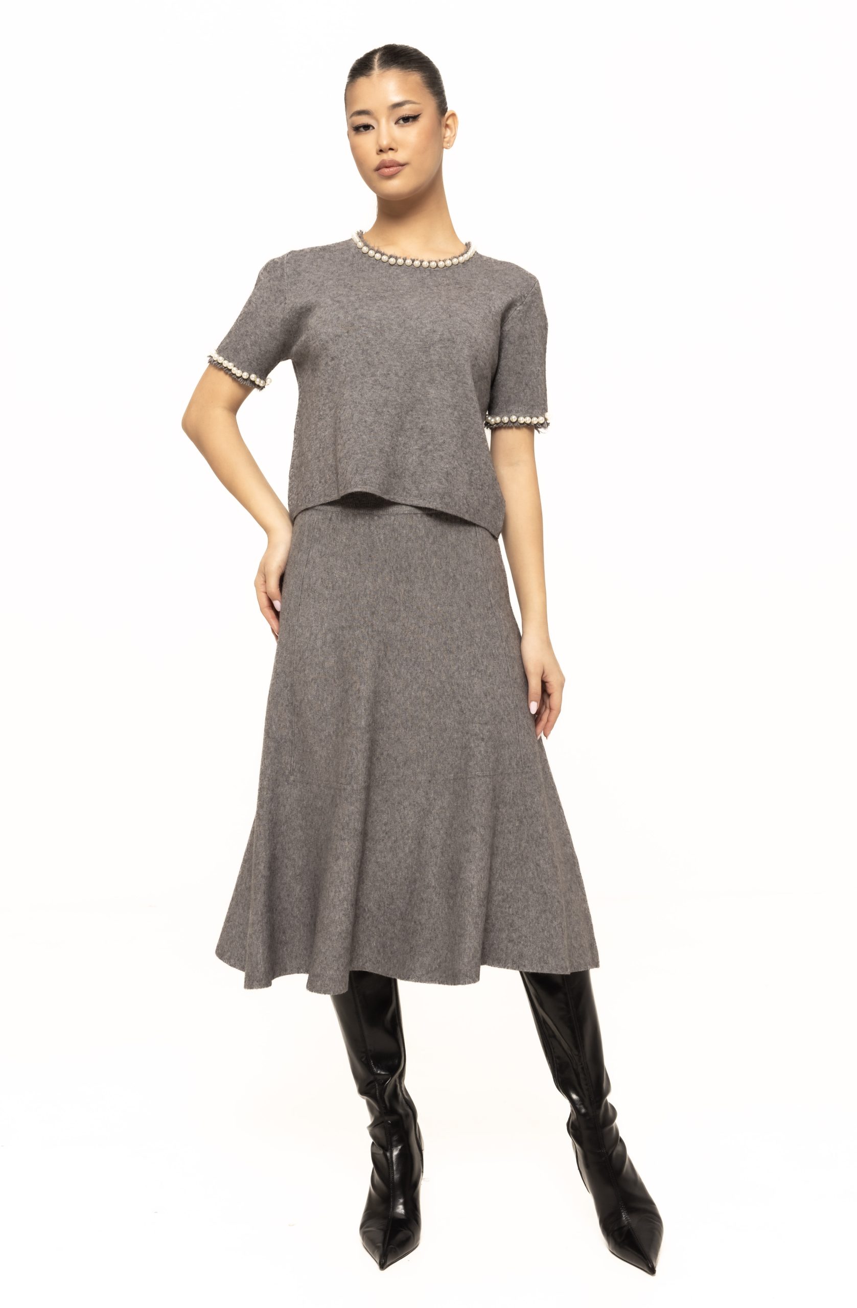 Designul minimalist permite combinarea fustei cu o varietate de piese vestimentare, de la pulovere și helanci, până la bluze elegante sau cardigane. Tricotul conferă un plus de textură ținutei, aducând un aer cald și cozy, ideal pentru zilele răcoroase.
