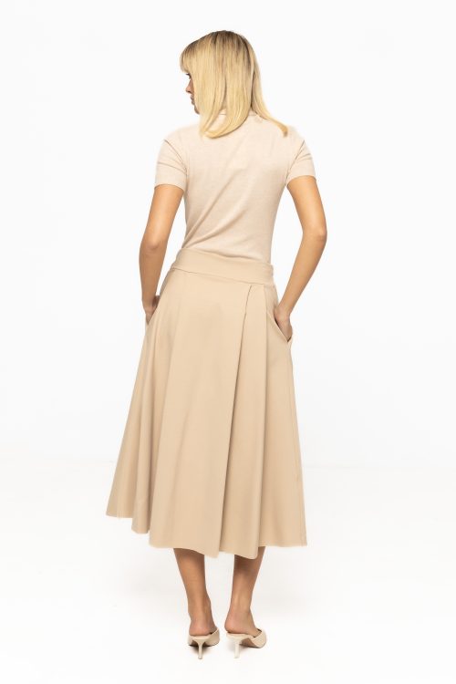 Această fustă poate fi integrată cu ușurință în outfituri office, casual sau elegante. Poate fi purtată cu cămăși, bluze fine, pulovere sau topuri elegante, adaptându-se stilului personal și cerințelor diferitelor ocazii. Buzunarele aplicate adaugă un plus de funcționalitate, permițând păstrarea obiectelor mici fără a compromite estetica generală a fustei. Accesoriile precum curele subțiri, genți elegante sau bijuterii delicate completează armonios look-ul, transformând fusta Octavia într-o piesă centrală a garderobei.