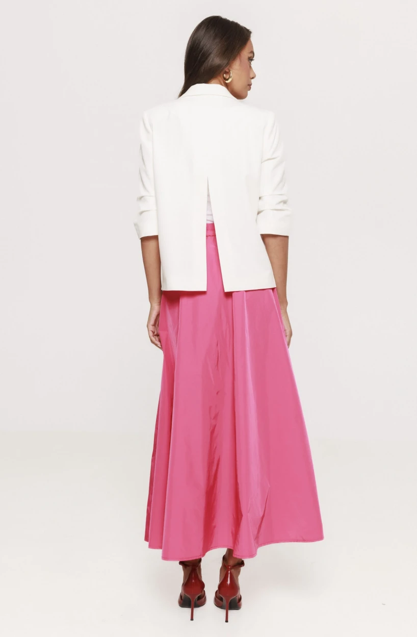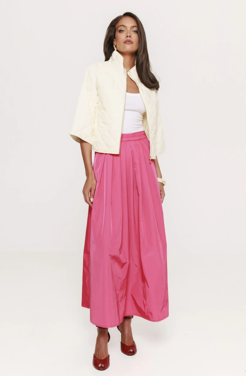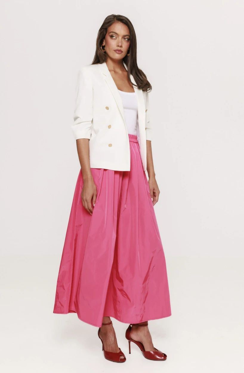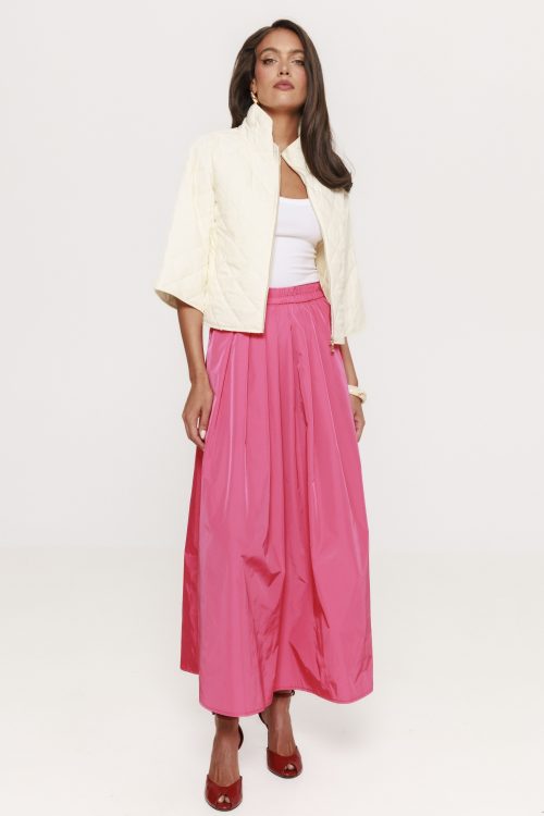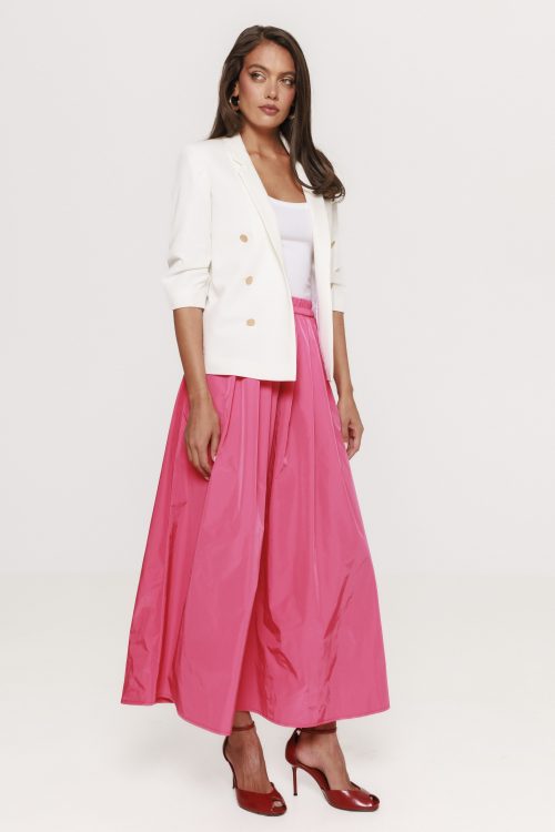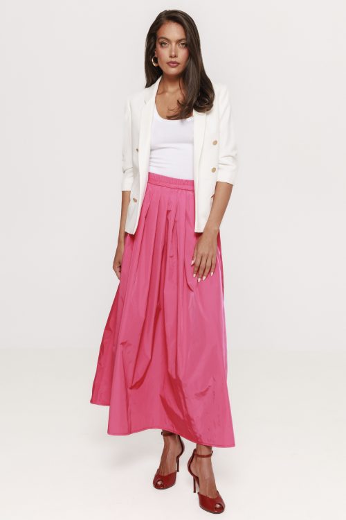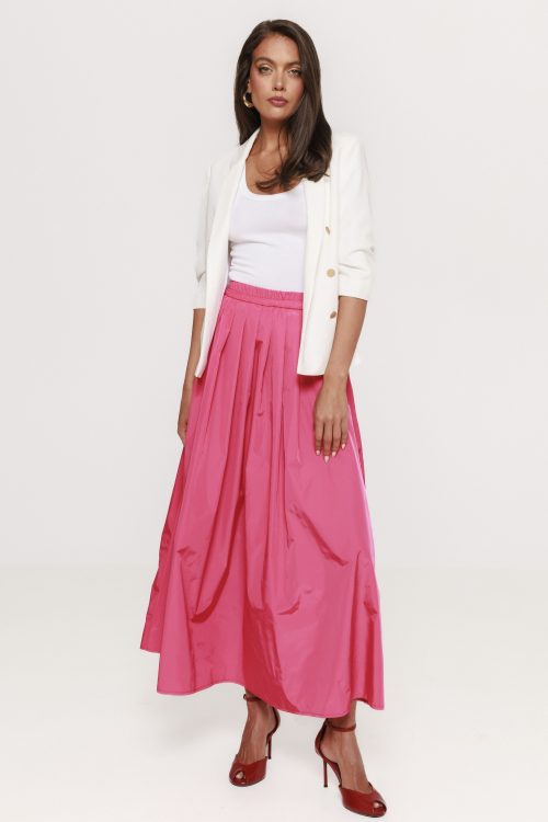 Culoarea fustei cu pliuri lejere Barbara, în nuanțe delicate de roz pudrat sau tonuri neutre, adaugă un plus de feminitate și rafinament. Această paletă cromatică este ușor de asortat și poate fi integrată în diverse combinații, de la cele monocrome la cele cu imprimeuri. Fusta cu pliuri lejere Barbara devine astfel o piesă de bază, dar în același timp de impact.