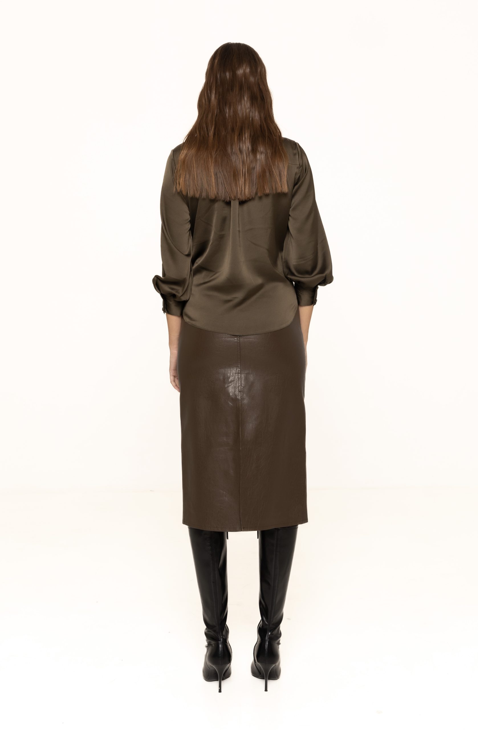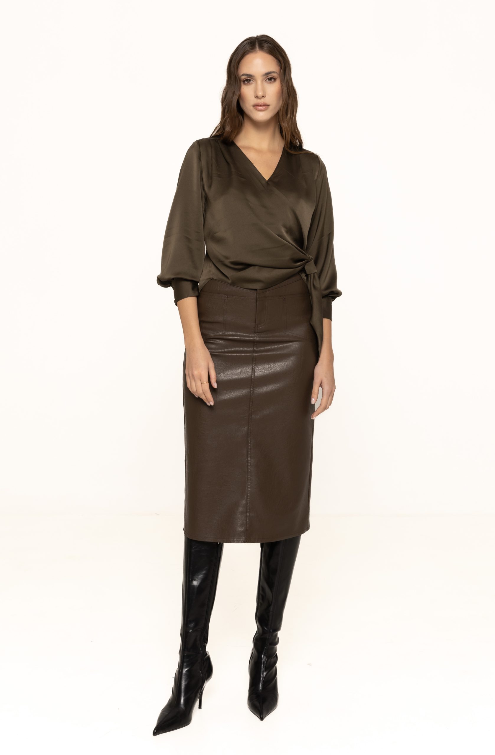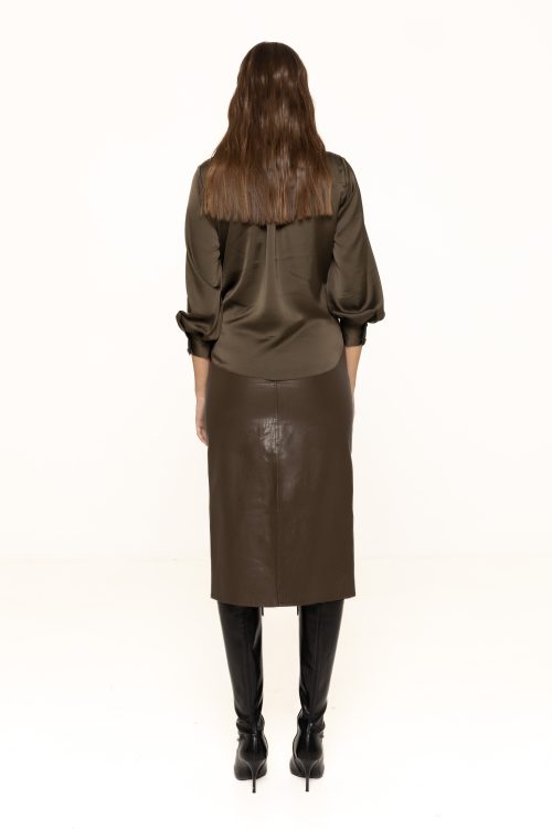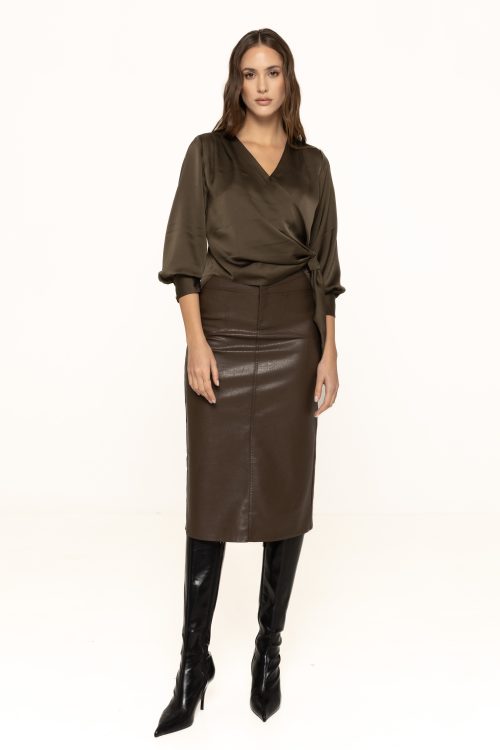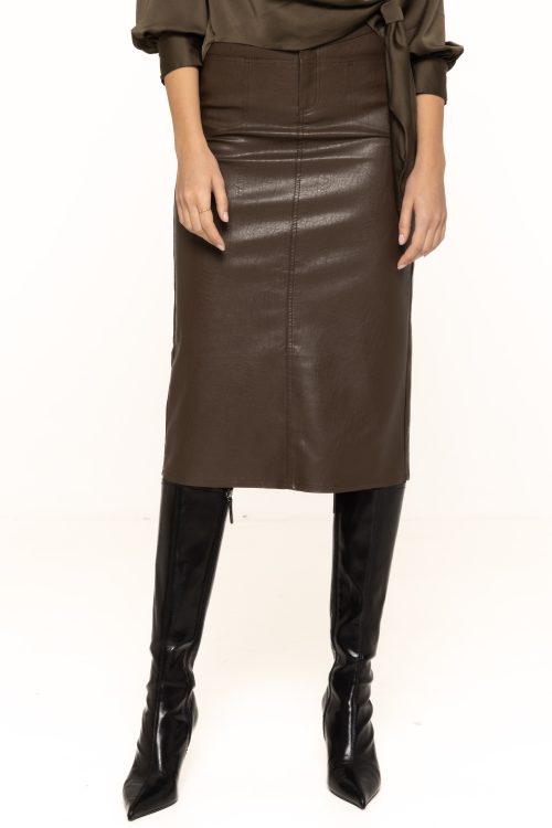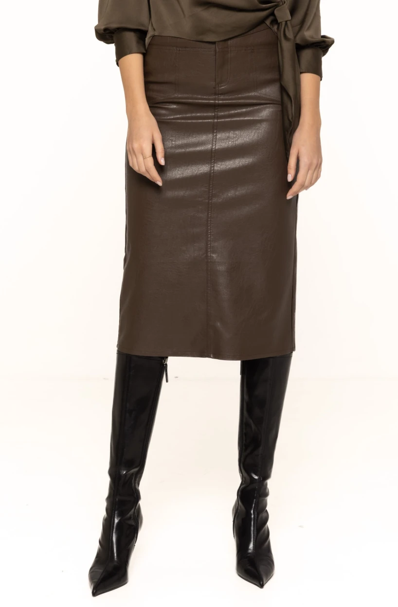 Fusta din piele ecologică Alexia este perfectă pentru birou, datorită aspectului ei structurat și profesionist. Poate fi combinată cu o cămașă clasică, un sacou sau un cardigan elegant. În același timp, este o alegere potrivită pentru ținute casual-chic, purtată cu un tricou simplu, o bluză lejeră sau o cămașă oversized. Pentru un look de seară, fusta Alexia poate fi asortată cu un top strălucitor sau cu o bluză din dantelă, rezultând o ținută modernă și atrăgătoare.