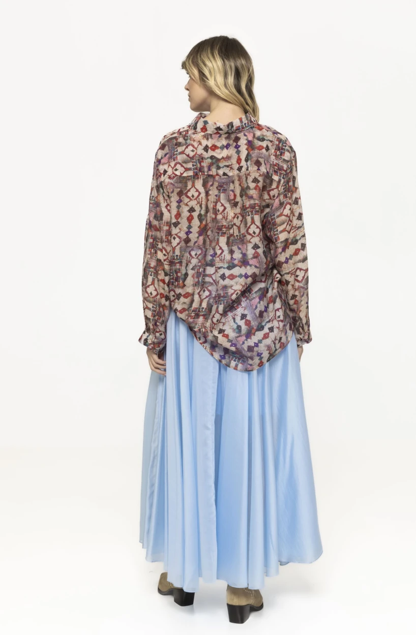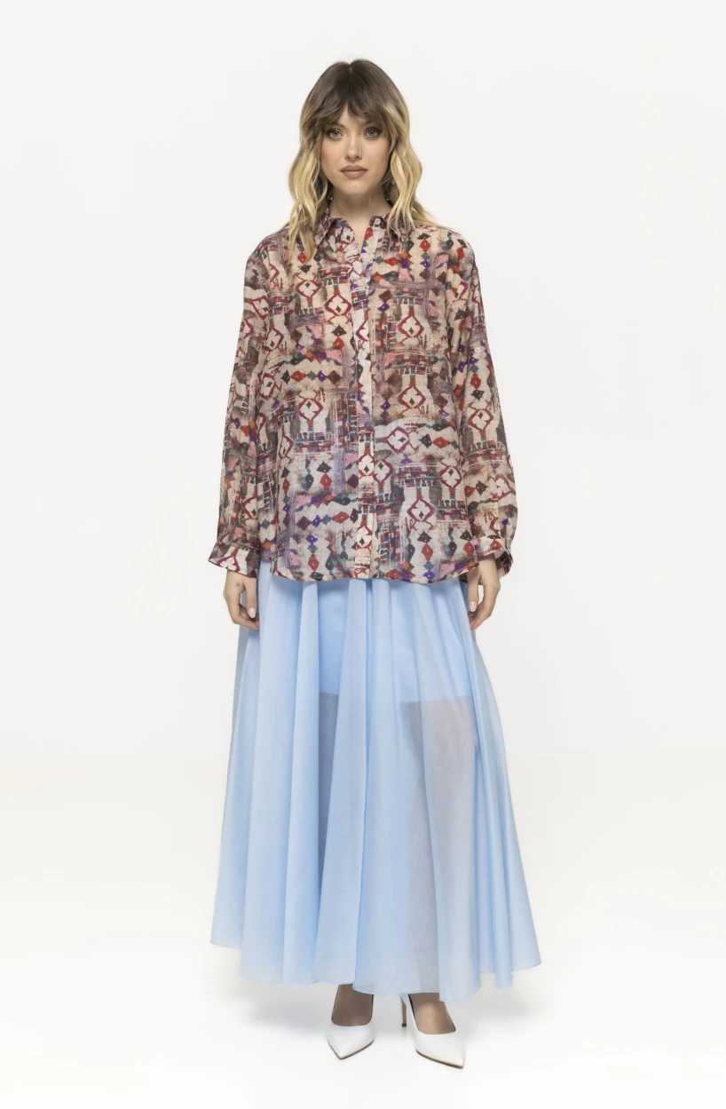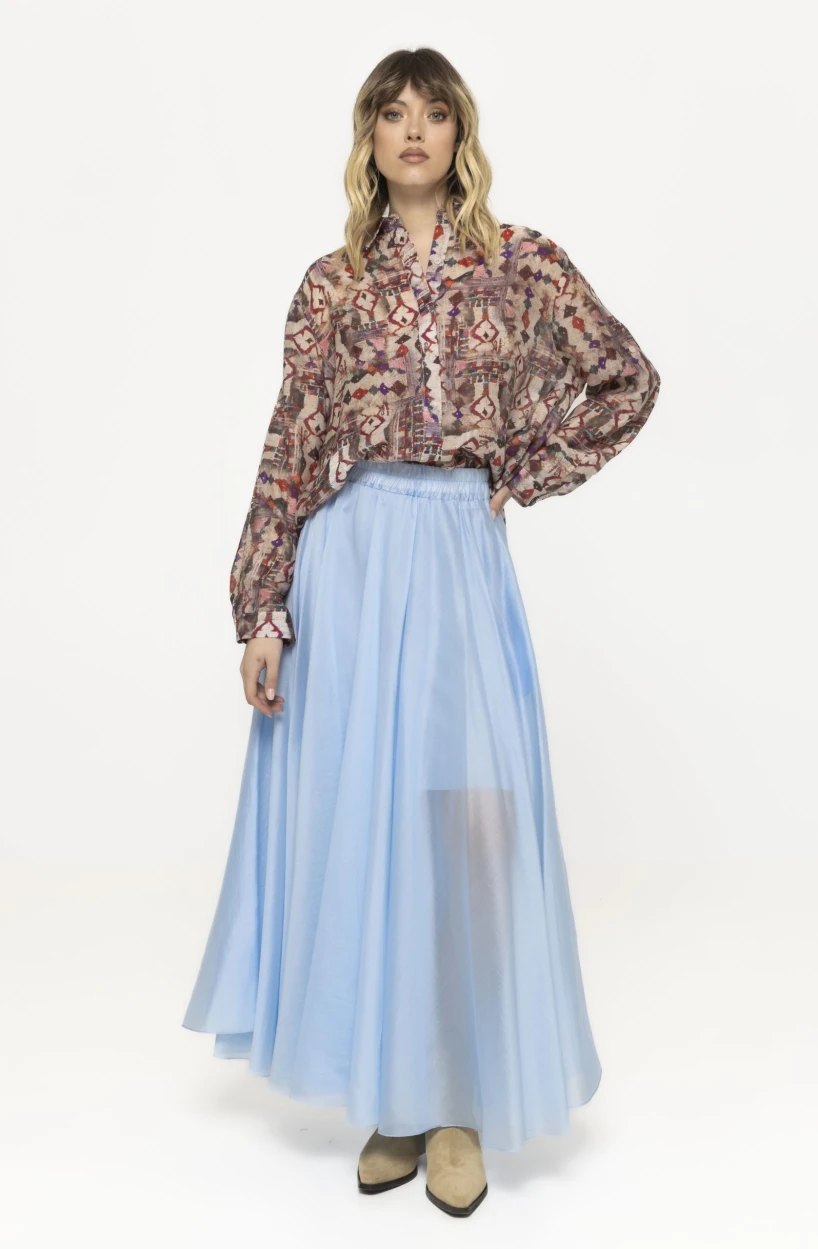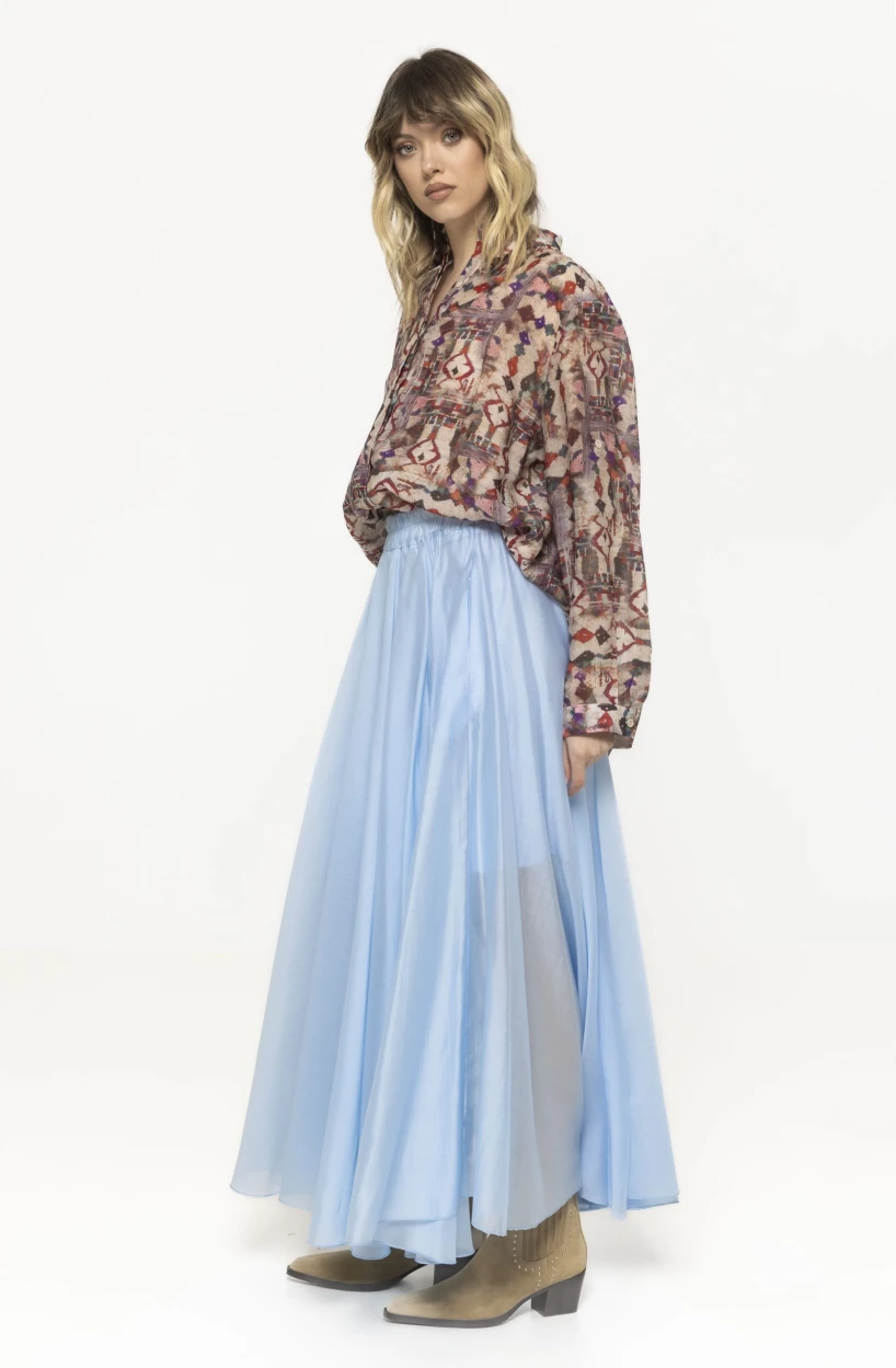 Unul dintre elementele principale care definesc fusta lungă Erika este croiala sa fluidă. Materialul ușor cade natural pe siluetă și creează un efect delicat atunci când fusta este purtată. Acest tip de croială este foarte apreciat în moda feminină deoarece oferă libertate de mișcare și avantajează diferite tipuri de conformație. Fusta se mișcă elegant la fiecare pas și adaugă un aer romantic și rafinat întregii ținute.