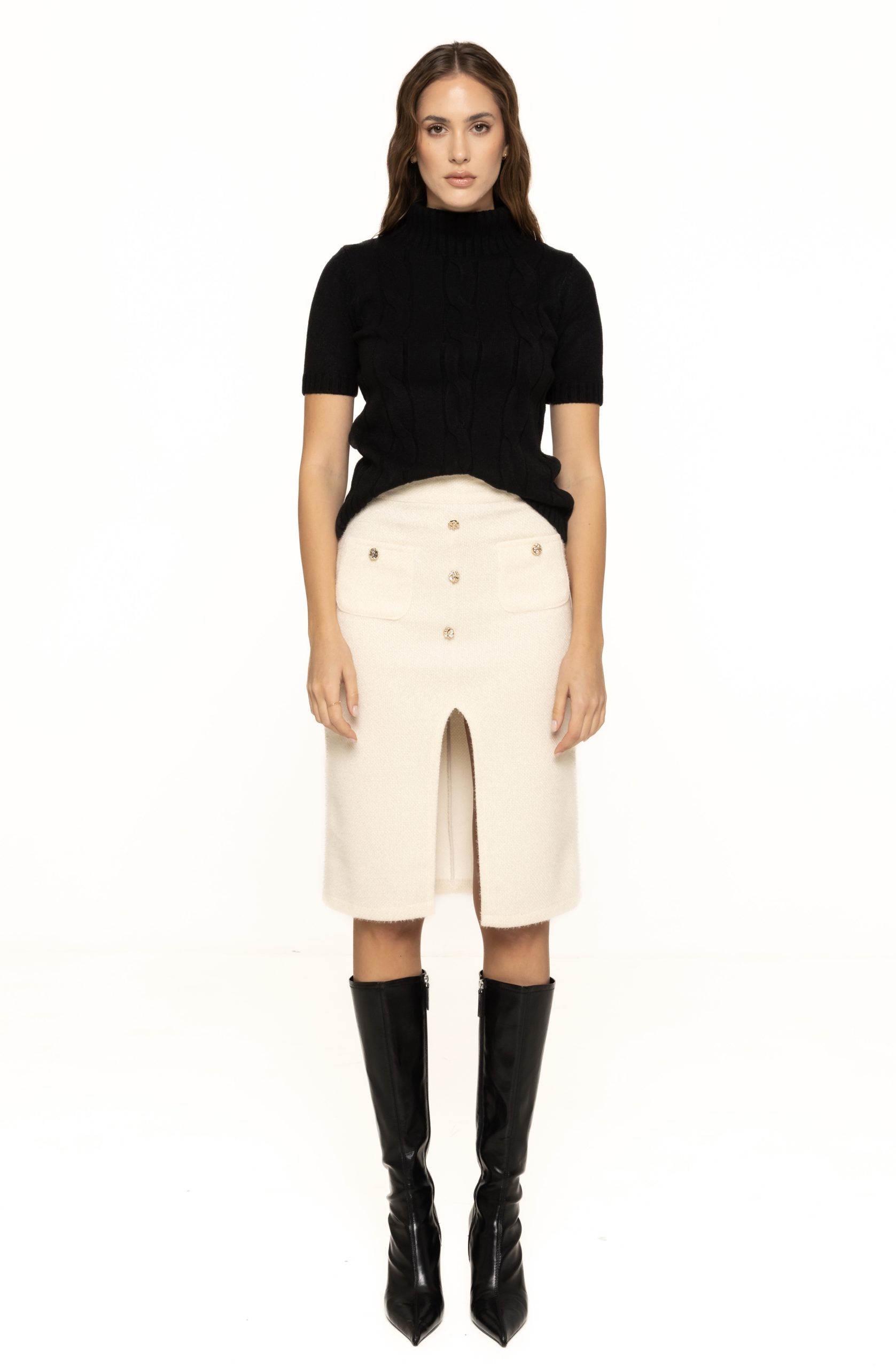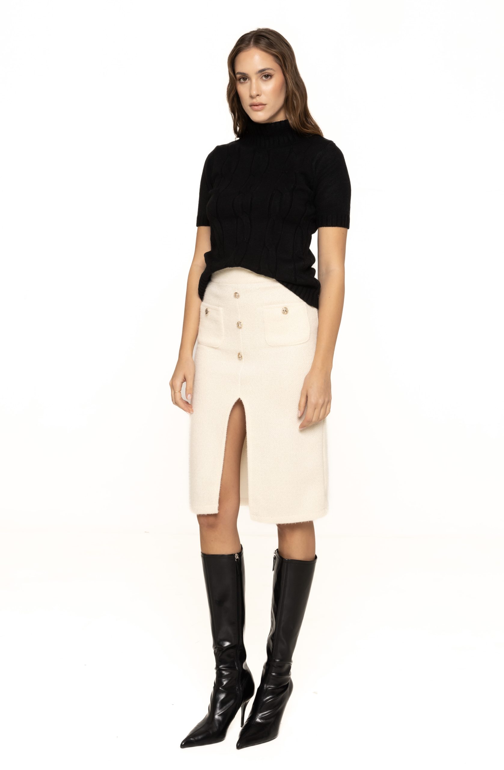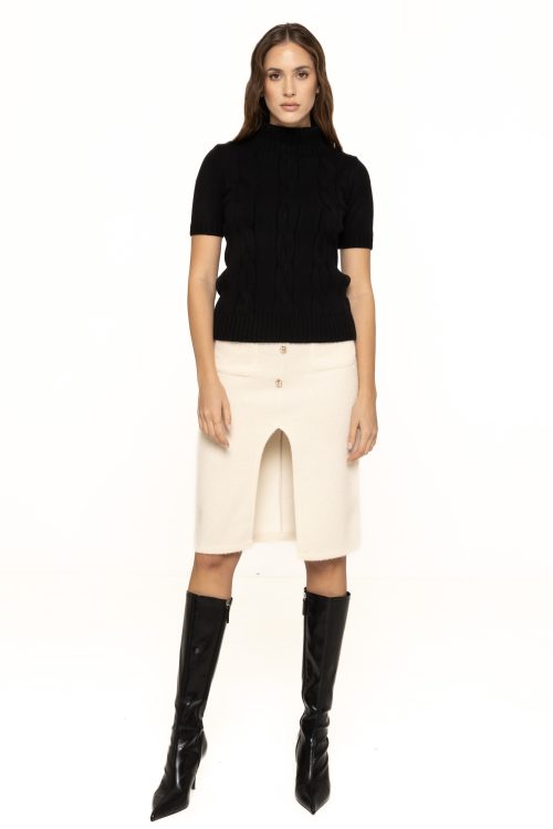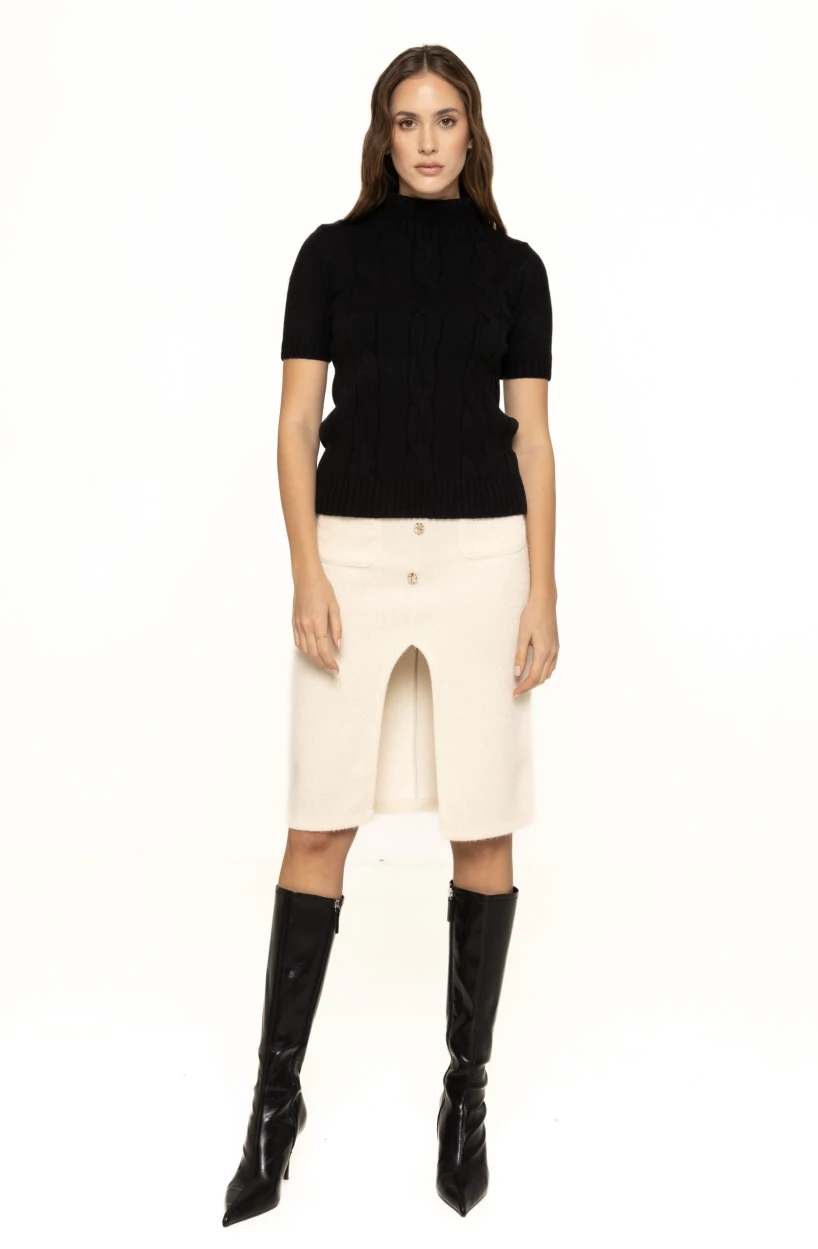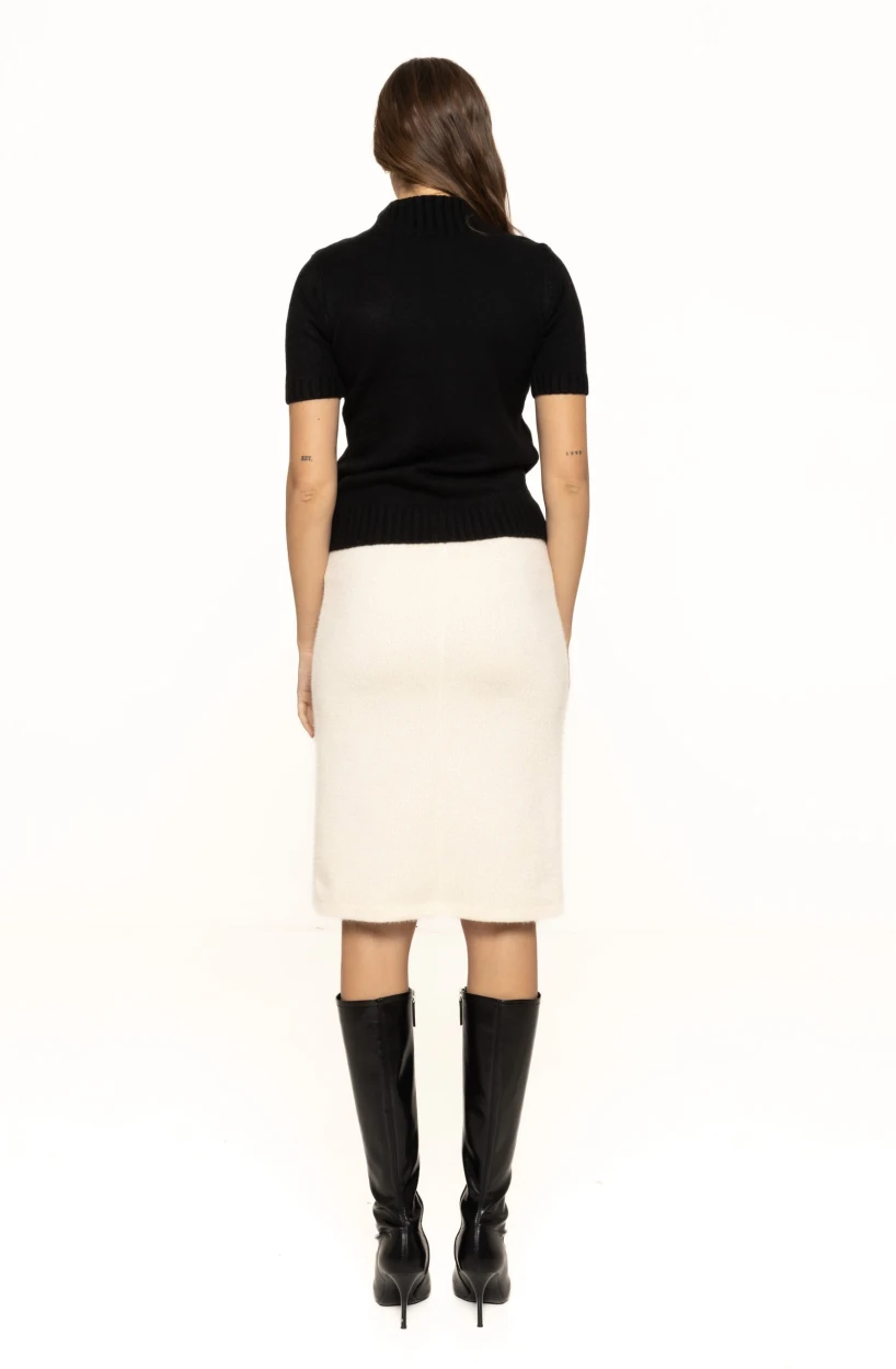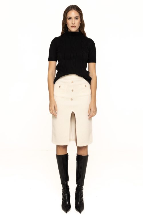 Fusta mulată cu nasturi decorativi Alice se poate integra cu ușurință în diverse ținute: