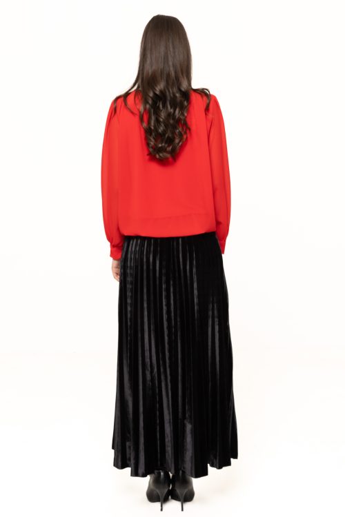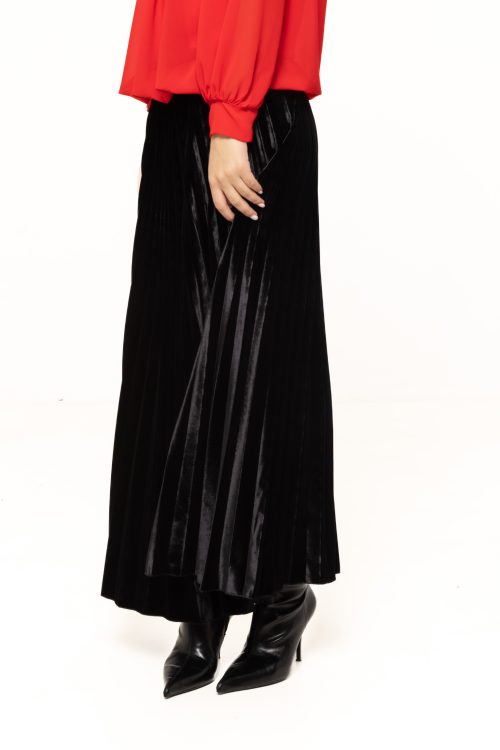 Fusta plisată din catifea Criss este extrem de versatilă și poate fi purtată în multiple combinații vestimentare. Pentru un look elegant de seară, fusta poate fi asortată cu o bluză satinatată sau un top fin, completat de pantofi cu toc, botine elegante sau sandale rafinate. Într-o variantă casual-chic, fusta poate fi purtată cu pulovere oversized, bluze tricotate sau tricouri simple, adăugând un contrast interesant între textura luxoasă a catifelei și simplitatea pieselor casual. Această versatilitate face ca fusta Criss să fie un element indispensabil în garderoba oricărei femei moderne.