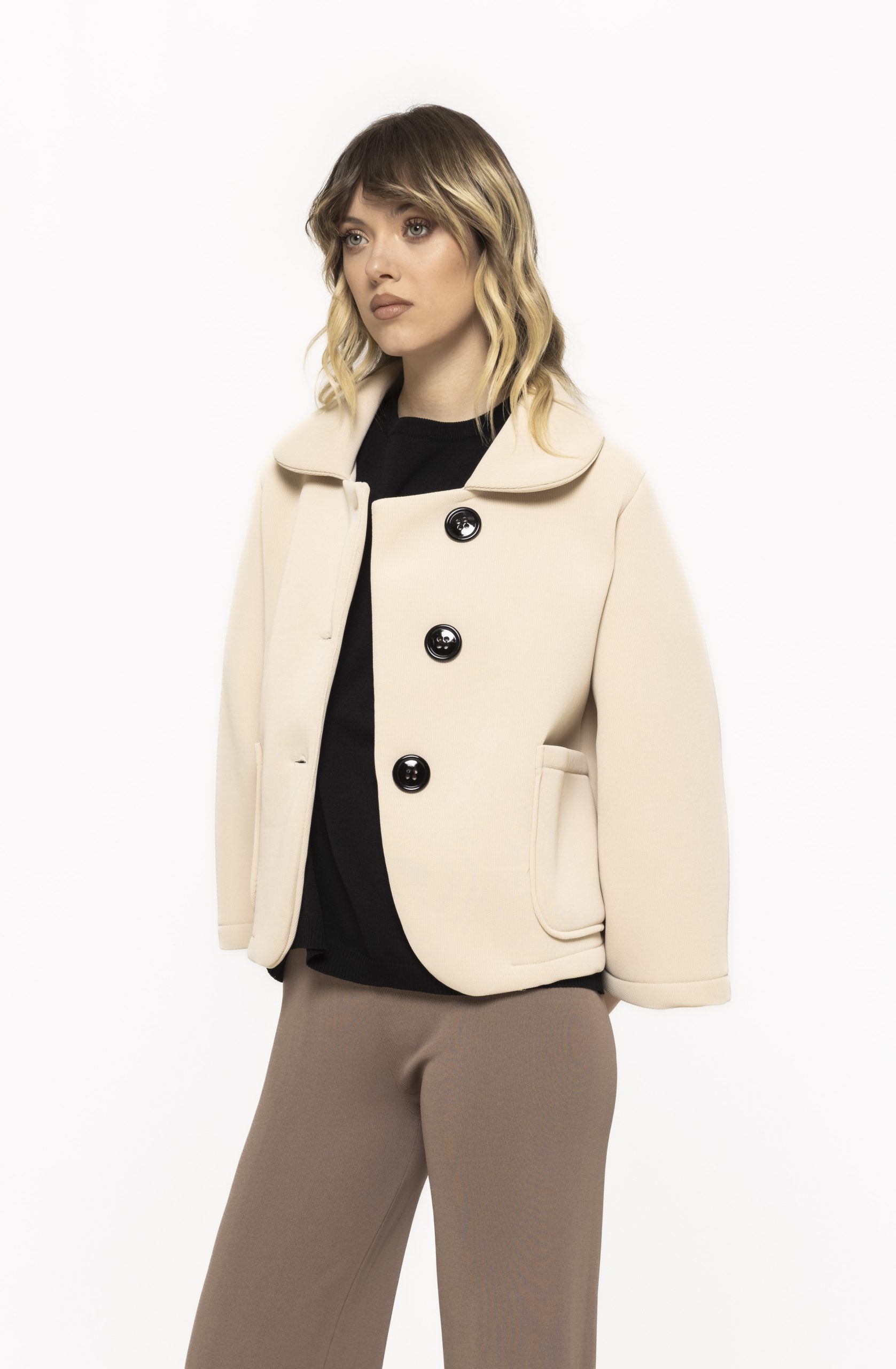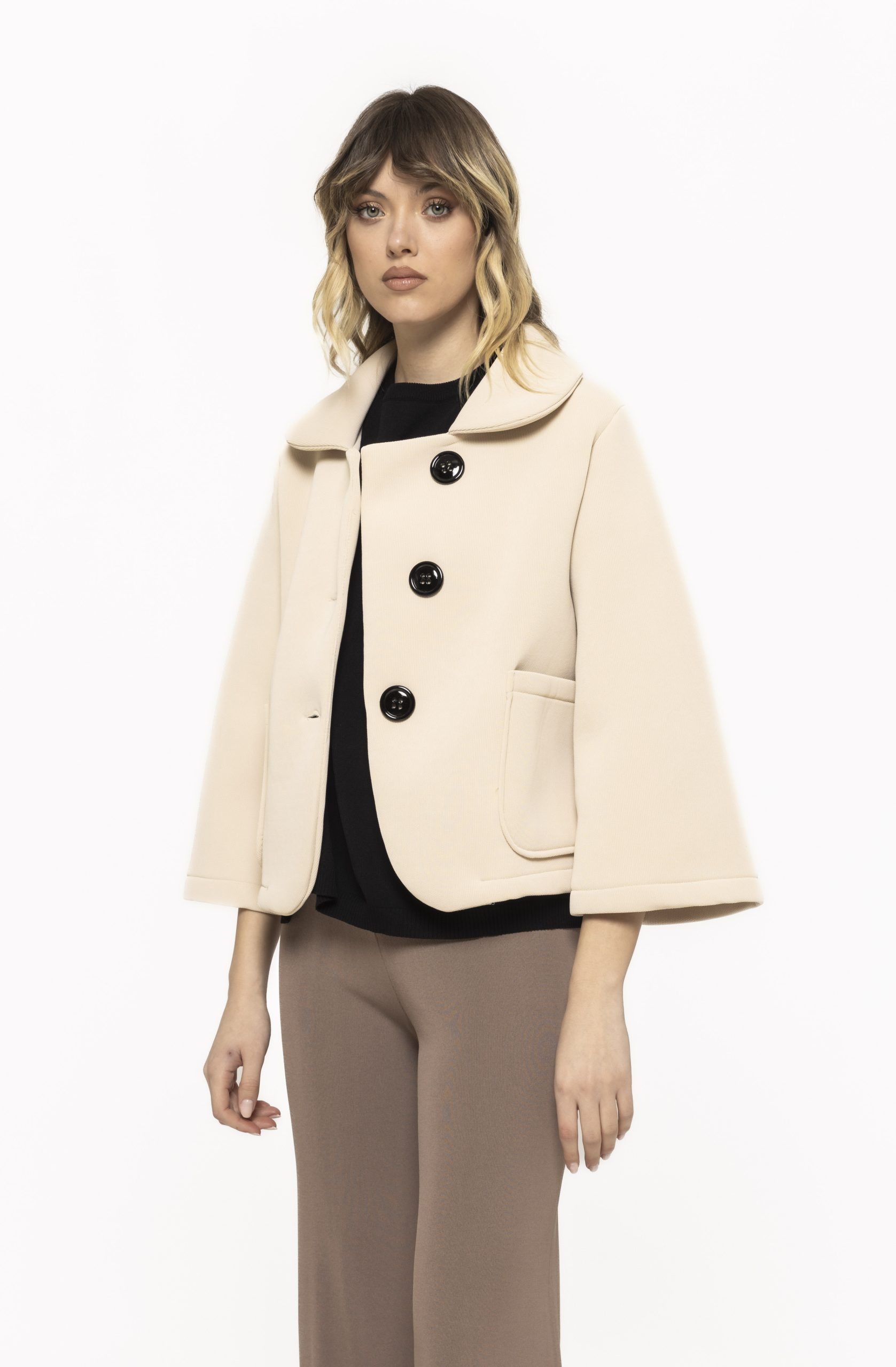Elementul distinctiv al jachetei Rania îl reprezintă mânecile largi, care adaugă volum și dinamism întregii ținute. Această croială creează un efect vizual sofisticat și oferă libertate totală de mișcare.