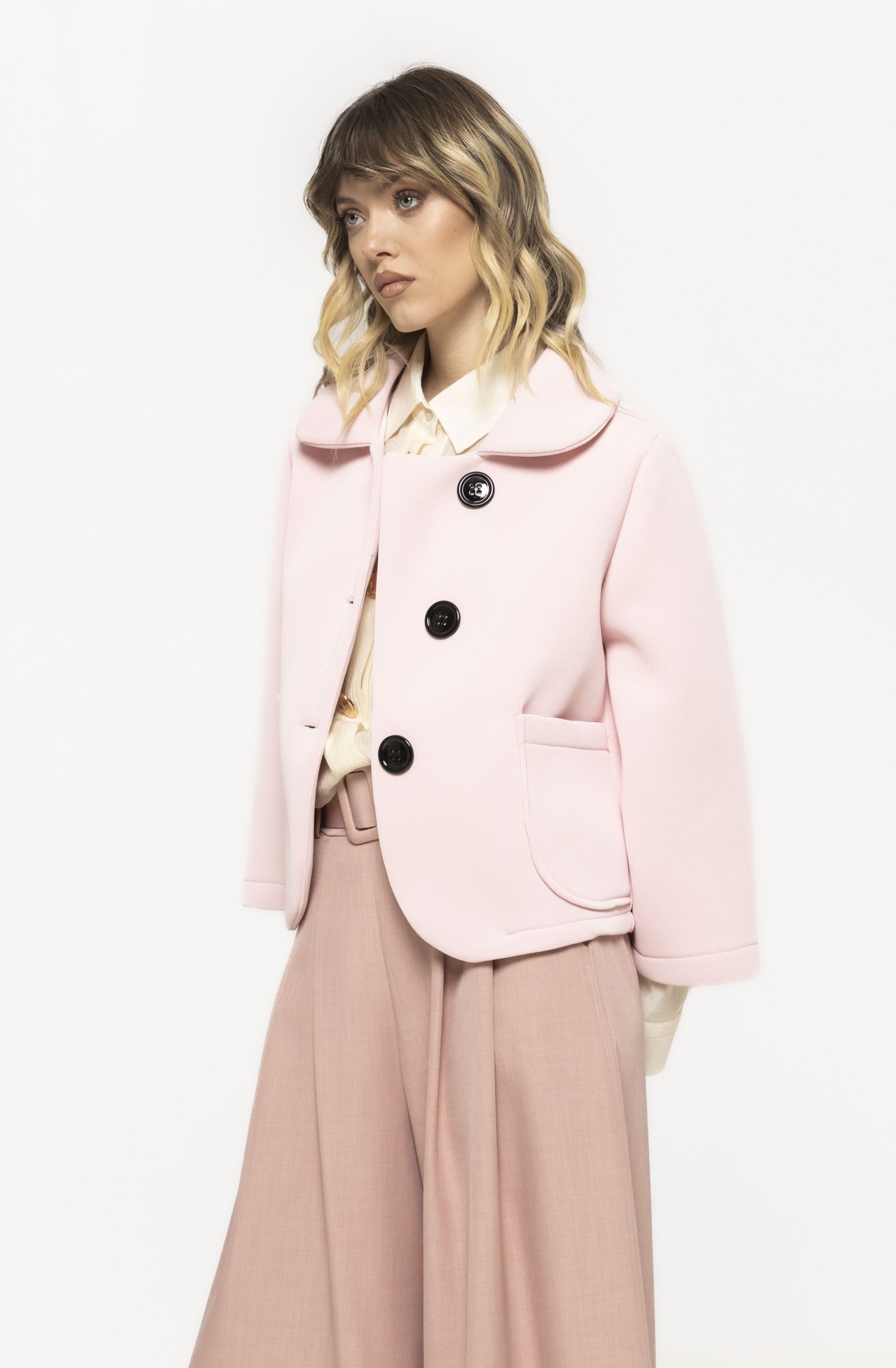 Mânecile ample aduc un aer contemporan și ușor arhitectural, transformând jacheta într-o piesă cu personalitate. Este genul de detaliu care atrage privirile fără să fie exagerat, păstrând eleganța într-o zonă minimalistă.