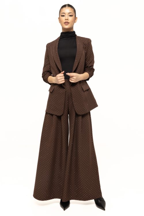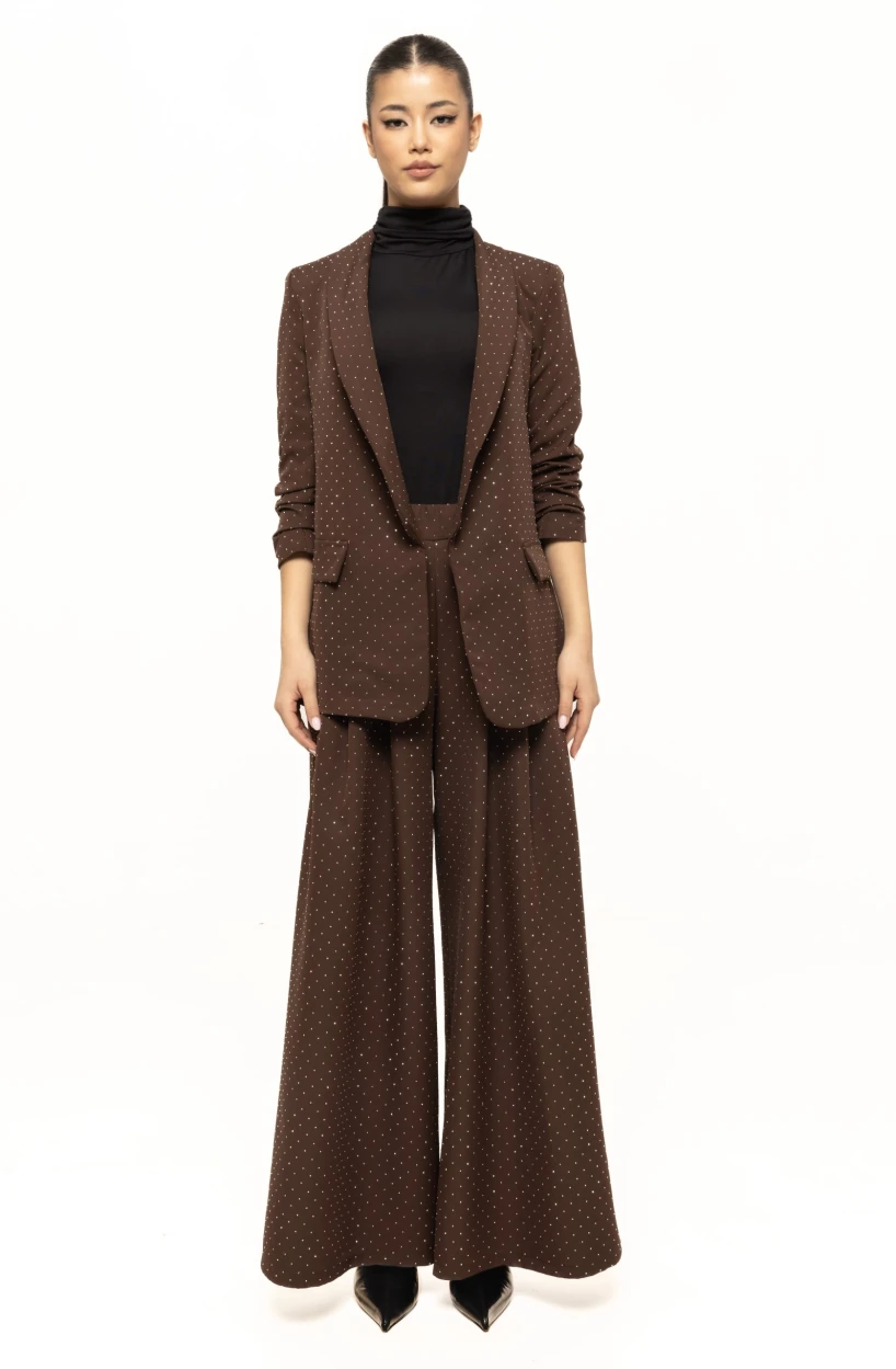 Strasurile aplicate uniform pe întreaga suprafață a pantalonilor conferă un efect vizual spectaculos, reflectând subtil lumina și oferind un aer glam fiecărei apariții. Aceste detalii delicate fac ca pantalonii Melisa să fie potriviți atât pentru ținute sofisticate, cât și pentru combinații moderne, cu influențe minimaliste. Este piesa ideală pentru femeile care iubesc rafinamentul și doresc să iasă în evidență printr-un stil elegant, fără a exagera.