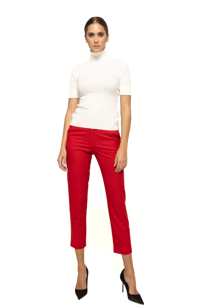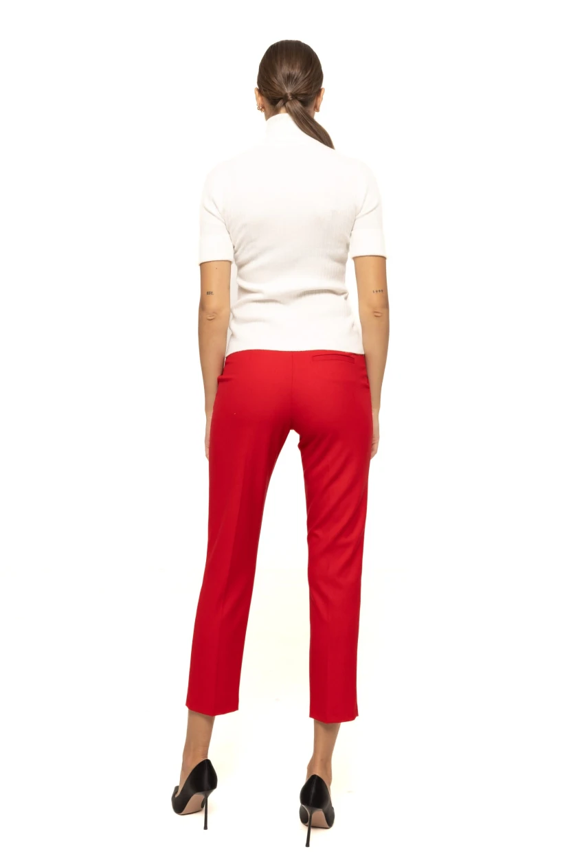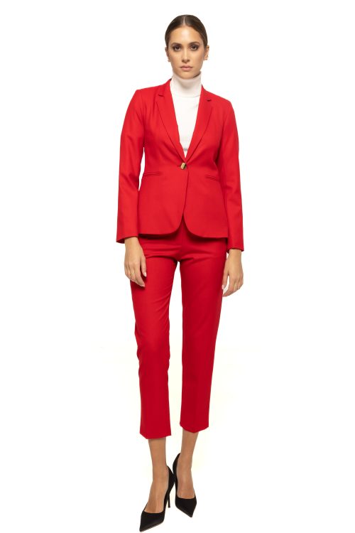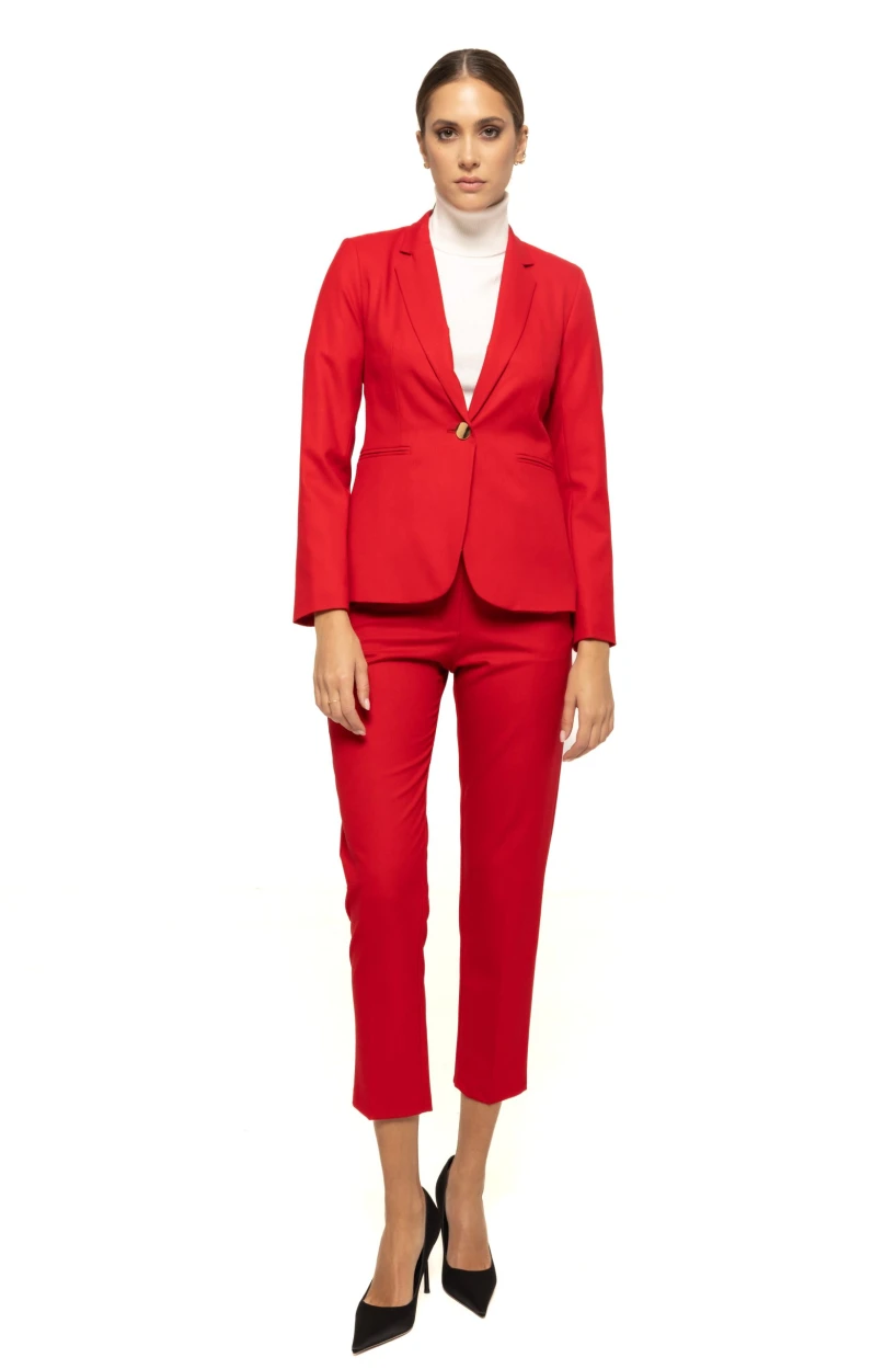 Fiecare element – de la croiala precisă, până la textura materialului – este gândit pentru a pune în valoare silueta feminină. Pantalonii se închid discret, oferind o linie curată și profesională, perfectă pentru ținutele de birou sau întâlnirile importante.