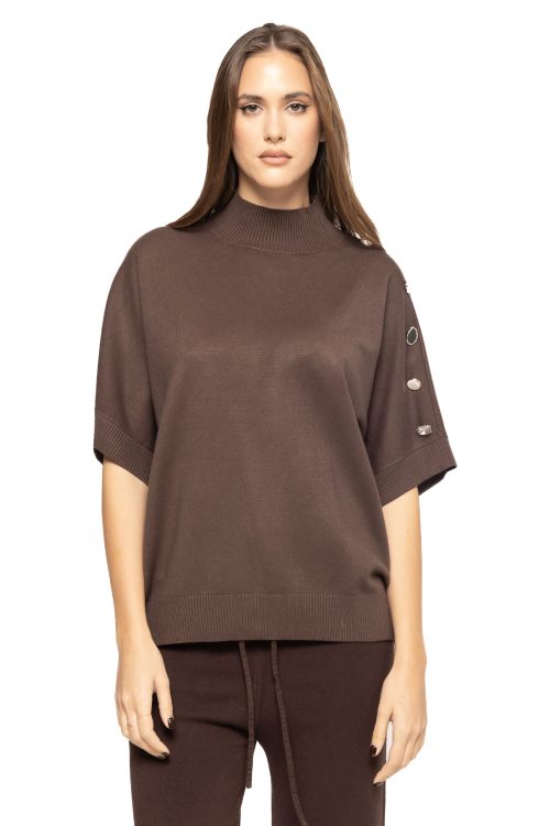 Ceea ce îl face cu adevărat special sunt aplicațiile de pietre dispuse pe umăr, un detaliu statement care adaugă personalitate și rafinament ținutei. Aceste aplicații sunt atent fixate, pentru a rezista în timp, și au un aspect sofisticat, inspirat din moda glamour. Contrastul dintre textura moale a tricotului și strălucirea pietrelor creează un efect vizual aparte, ideal pentru femeile care își doresc piese moderne, dar cu un plus de eleganță.